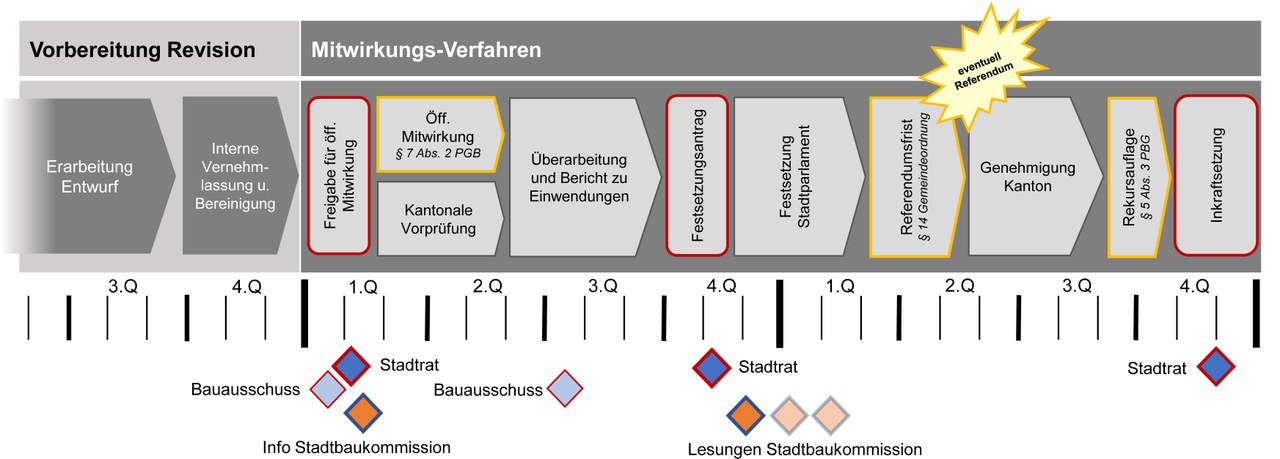 Für Bauvorhaben werden in den kommenden Jahren einzelne Revisionen der Gesetzgebung relevant und über die wesentlichen Änderungen mit konkreter Relevanz für Baugesuche soll hier laufend berichtet werden. Da es sich um laufende Verfahren handelt erfolgen die Angaben ohne Gewähr und die Termine können sich in Folge von Rechtsmittelverfahren, Referenden etc. verzögern. Auskünfte erteilt gerne die zuständige Abteilung Raumentwicklung im Amt für Städtebau.