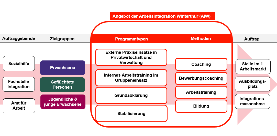 Wir sind eine Hauptabteilung im Departement Soziales der Stadtverwaltung Winterthur. Unsere Auftraggebende sind die Sozialen Dienste der Stadt Winterthur und umliegender Gemeinden, die Fachstelle Integration sowie das Amt für Arbeit (AFA). In ihrem Auftrag sind wir seit 1984 mit Arbeitsintegrationsmassnahmen in Stadt und Region Winterthur präsent und arbeiten intensiv mit Unternehmen aus der Privatwirtschaft, öffentlichen Verwaltungen und Non-Profit-Organisationen zusammen.