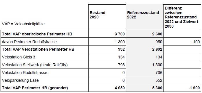 Inzwischen hat die Stadt die Anzahl Veloabstellplätze unter Berücksichtigung der laufenden Projekte ermittelt. Als Rahmenbedingung wurden zwei Perimeter (Perimeter «Umgebung Hauptbahnhof» für 7200 und Perimeter «Rudolfstrasse» für 1050 Plätze) bestimmt, die Bemessung zur Ermittlung der Anzahl Veloabstellplätze festgelegt und als Ausgangspunkt der Referenzzustand 2022 ermittelt. Somit konnte ausgerechnet werden, wie viele Veloabstellplätze in den einzelnen Perimetern noch fehlen.