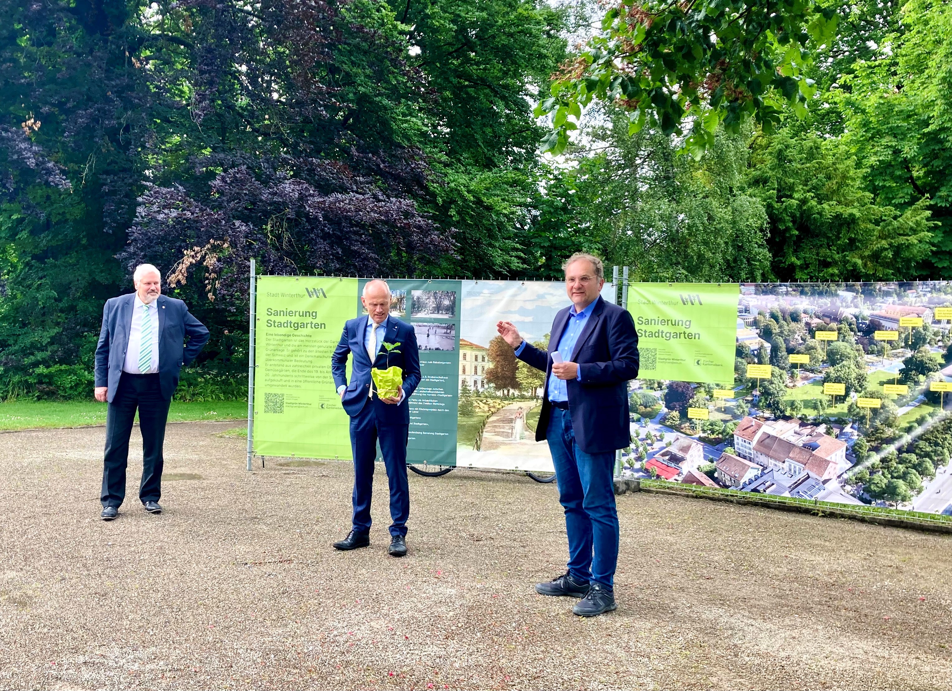 An einer Medienorientierung im Stadtgarten haben Stadtpräsident Michael Künzle, Stadtrat Stefan Fritschi und ZKB-Präsident Jörg Müller-Ganz heute über die Bedeutung der zentralen Parkanlage und die bevorstehenden Arbeiten informiert.