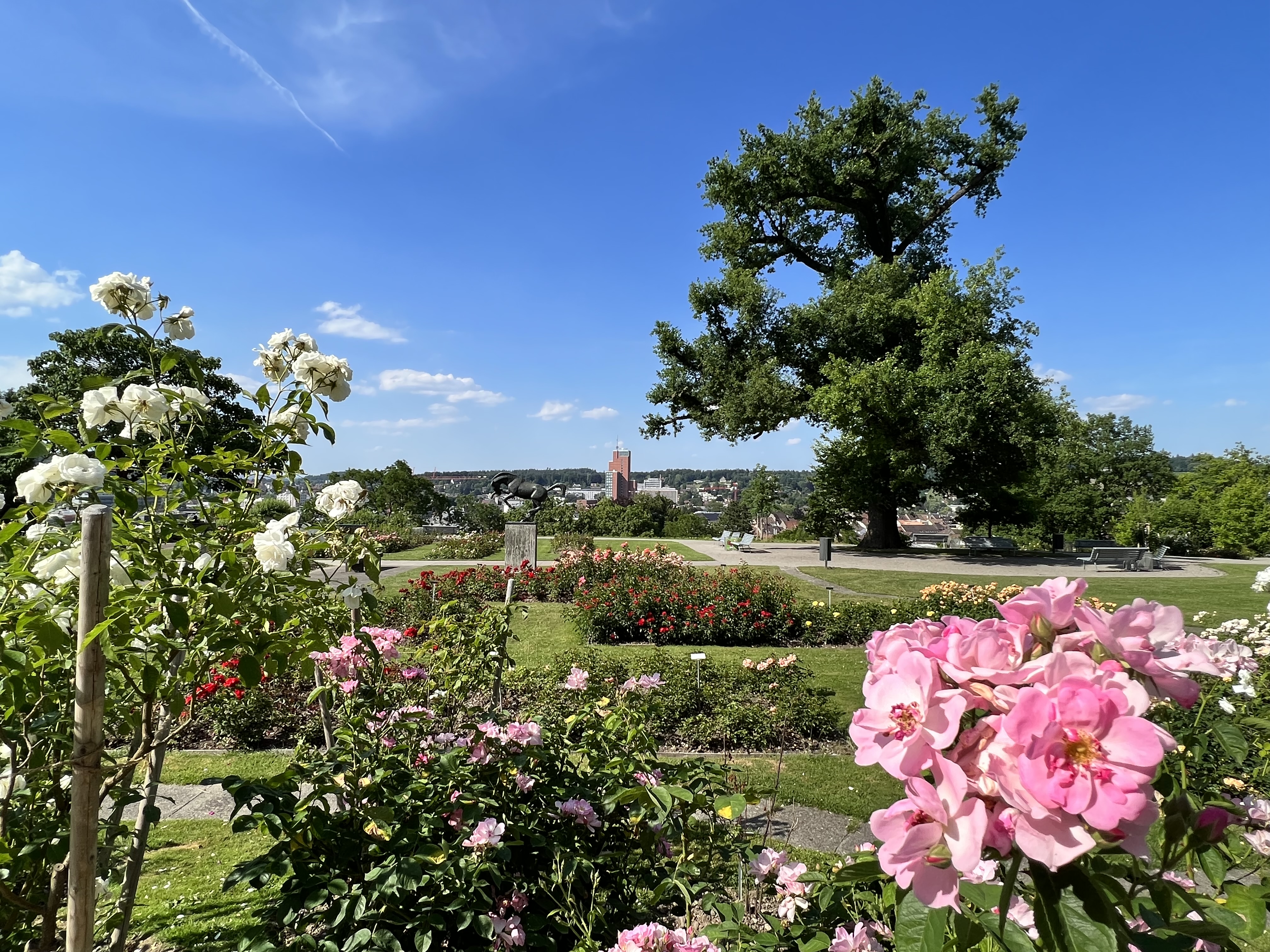 | Geschichte des Rosengartens Der Rosengarten wurde der Winterthurer Bevölkerung 1964 im Rahmen der städtischen 700-Jahr-Feier übergeben. Rund 2900 Rosen erblühen im Garten jedes Jahr in 300 Sorten. Darunter finden sich auch seltene und historische Rosen. Im Mittelalter standen in diesem Bereich die Jakobskirche und das Chorherrenstift. Darum erhielt der Hügel oberhalb des Städtchens Winterthur auch den Namen «Heiligberg». Sowohl Kirche wie auch Stift wurden von Graf Ulrich von Kyburg erbaut. Später fiel beides unter die Herrschaft von Zürich. Nach der Aufhebung des Stifts im Zuge der Reformation im 16. Jahrhundert erwarb die Stadt Winterthur das gesamte Grundstück auf dem Heiligberg, teilte es auf und verkaufte es an verschiedene Stadtbürger. Der Teil mit dem Rosengarten gehörte im Jahr 1911 der Familie Reinhart. Zu dem Zeitpunkt war der Rosengarten ein Teilbereich ihres Villengartens. In diesem Jahr erstellten die Architekten Rittmeyer und Furrer das Teehaus, das sich heute noch im Rosengarten befindet. 1961 kaufte die Stadt Winterthur das Grundstück wieder zurück und liess vom damaligen Stadtgärtner Johannes Müller einen Rosengarten anlegen. |