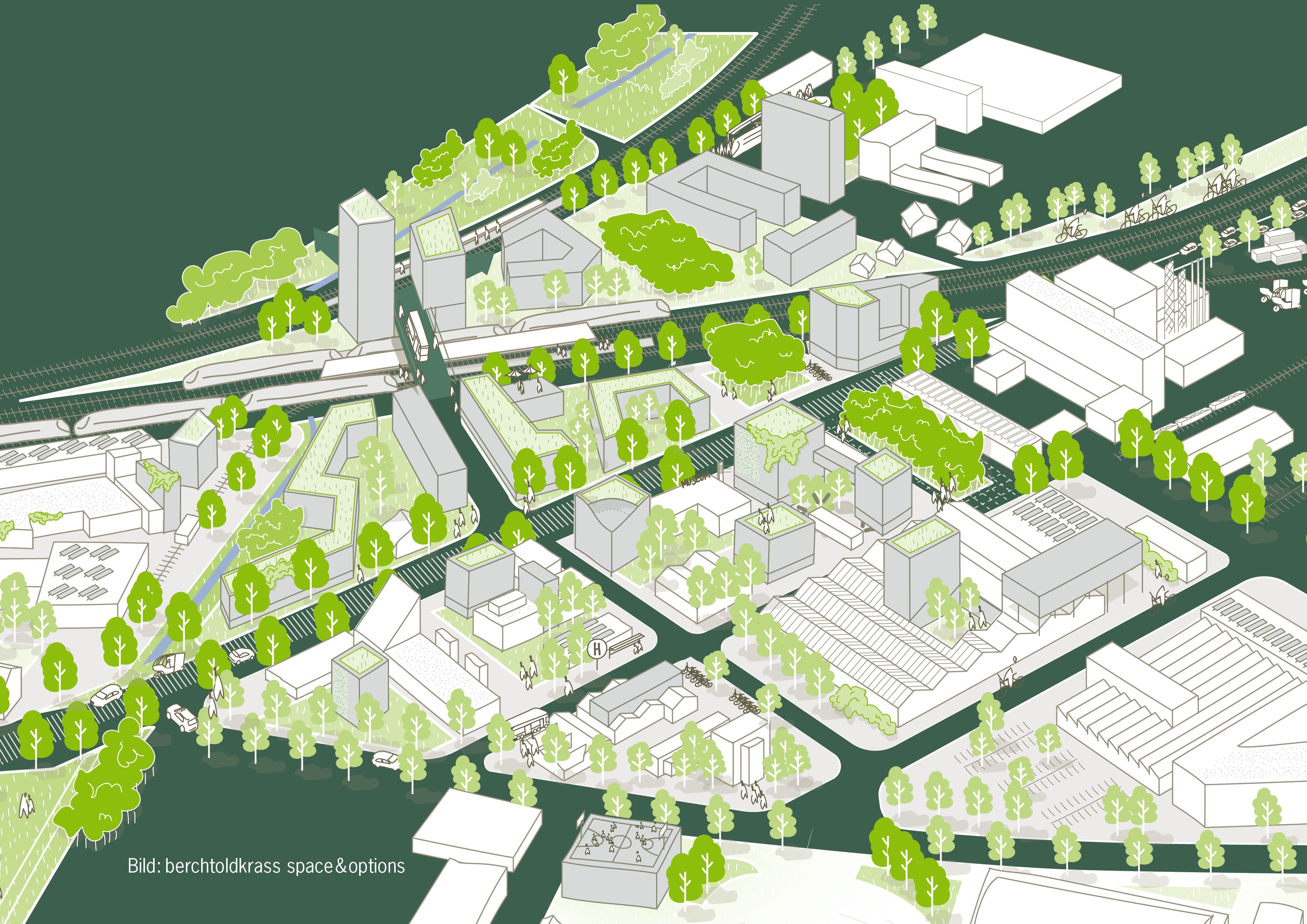 Von der Baubrache zur Verkehrsdrehscheibe: Das Gelände zwischen den Bahnlinien nach St. Gallen und Frauenfeld, das sich wegen der aktuellen Bauarbeiten weitgehend als leere Fläche präsentiert, wird sich in den nächsten Jahren weiterentwickeln zu einem durchmischten städtischen Quartier mit attraktiven Freiräumen. Der Gestaltungsplan Umfeld Grüze sieht eine dichte und hohe Bebauung mit Dienstleistungs- und Wohnnutzungen vor. Mit der Busbrücke,