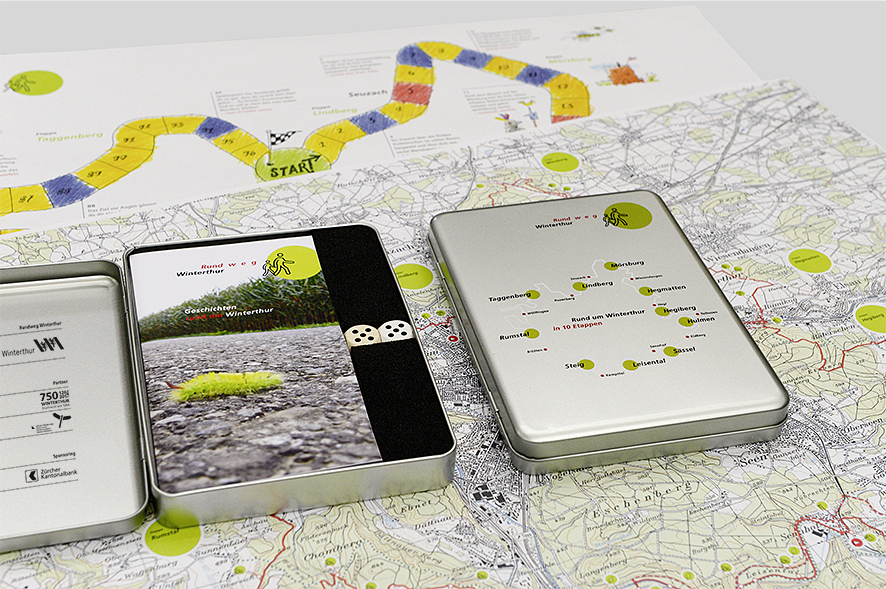 Die Rundweg-Karte wurde in Grossauflage gedruckt. Sie enthält verschiedene Piktogramme mit Hinweisen auf Sehenswürdigkeiten, Rastplätze, Aussichtspunkte, Bademöglichkeiten etc. Ab 22. Mai kann sie bei Winterthur Tourismus, im Hallenbad Geiselweid und in den Winterthurer Bibliotheken gratis bezogen werden. Auf der Rückseite der Karte ist der Rundweg als grosses Würfelspiel aufgedruckt. Es funktioniert nach dem Prinzip des «Leiterlispiels». Die Textfelder beziehen sich auf den jeweiligen Standort des realen Rundweges. Ab Donnerstag wird zudem eine Rundweg-App mit dem gesamten Kartenmaterial aufgeschaltet, die kostenlos heruntergeladen werden kann.