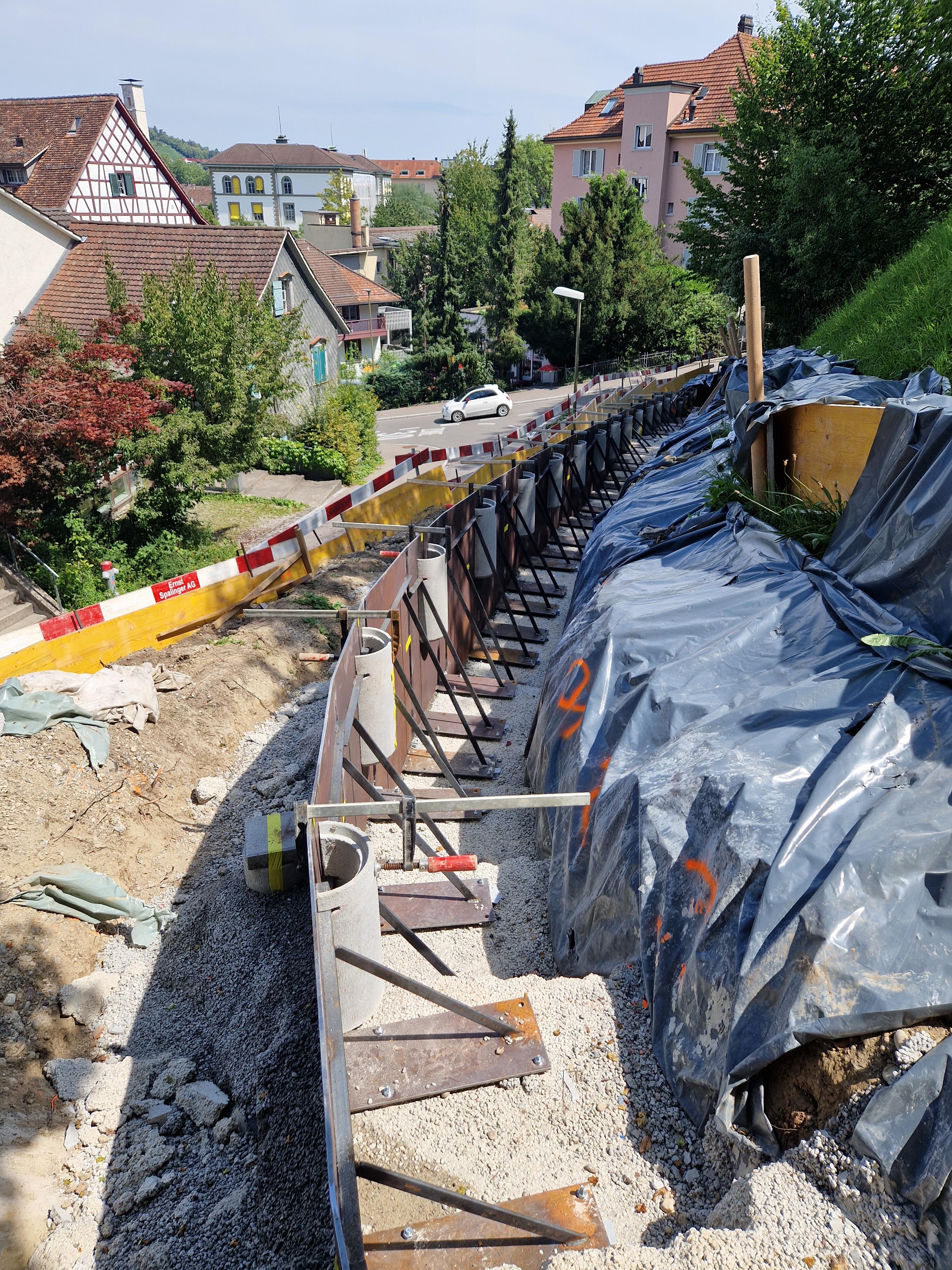 Um die historische Stützmauer vom Hangdruck zu entlasten, wurde ein etwa zwei bis drei Meter breiter Streifen der Böschung, der bis zur Maueraussengrenze geführt hatte, abgetragen. Der neue Fussweg wurde mit Metallwinkelplatten auf der darunterliegenden Felsoberfläche verankert und mit Sickerbeton fundiert. Dank dieser Lösung halten die Winkelplatten den Hangdruck von der Stützmauer fern. Der Fuswsweg wurde mit einem sickerfähigen Asphaltbelag erstellt. Die Sicherheit der Fussgängerinnen und Fussgänger ist durch neue Handläufe und Zäune gewährleistet. Für die Pflege der Pflanzböschung oberhalb der Natursteinmauer wurde ein Seilsicherungssystem installiert. Die Bepflanzung mit einheimischen Stauden und die Ergänzung der Bäume wird durch die Mitarbeitenden von Stadtgrün in der laufenden Pflanzsaison ausgeführt.