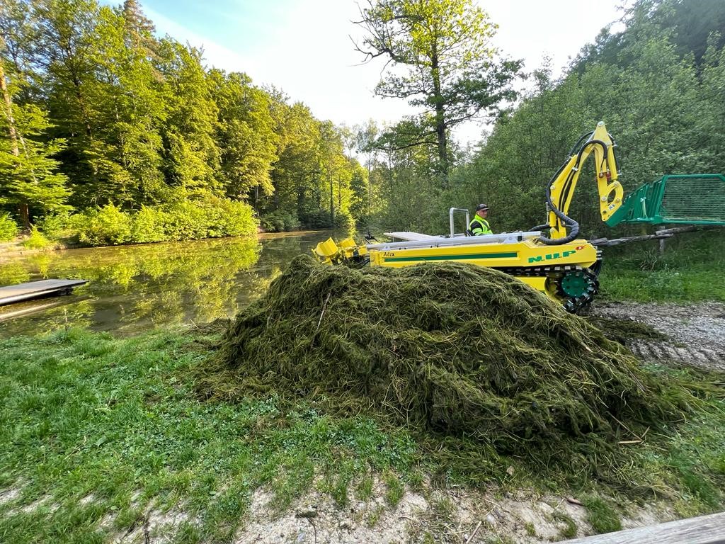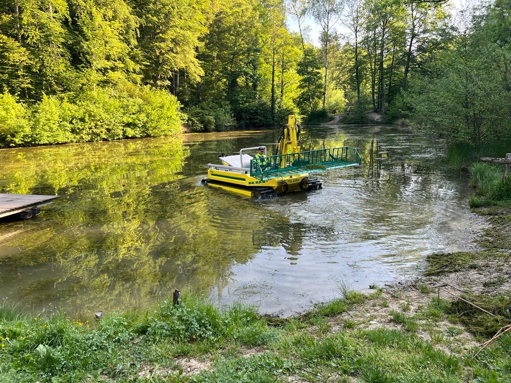 Der mittlere Walcheweiher wurde diese Woche mit Hilfe eines Spezialboots von Wasserpflanzen befreit. Das Amphibienfahrzeug, das mit einer speziellen Konstruktion ausgestattet ist, schneidet und rupft die Pflanzen. Dies soll ein allzu schnelles Nachwachsen verhindern. Auf den Schutz von Fischen und anderen Lebewesen wurde Rücksicht genommen.
