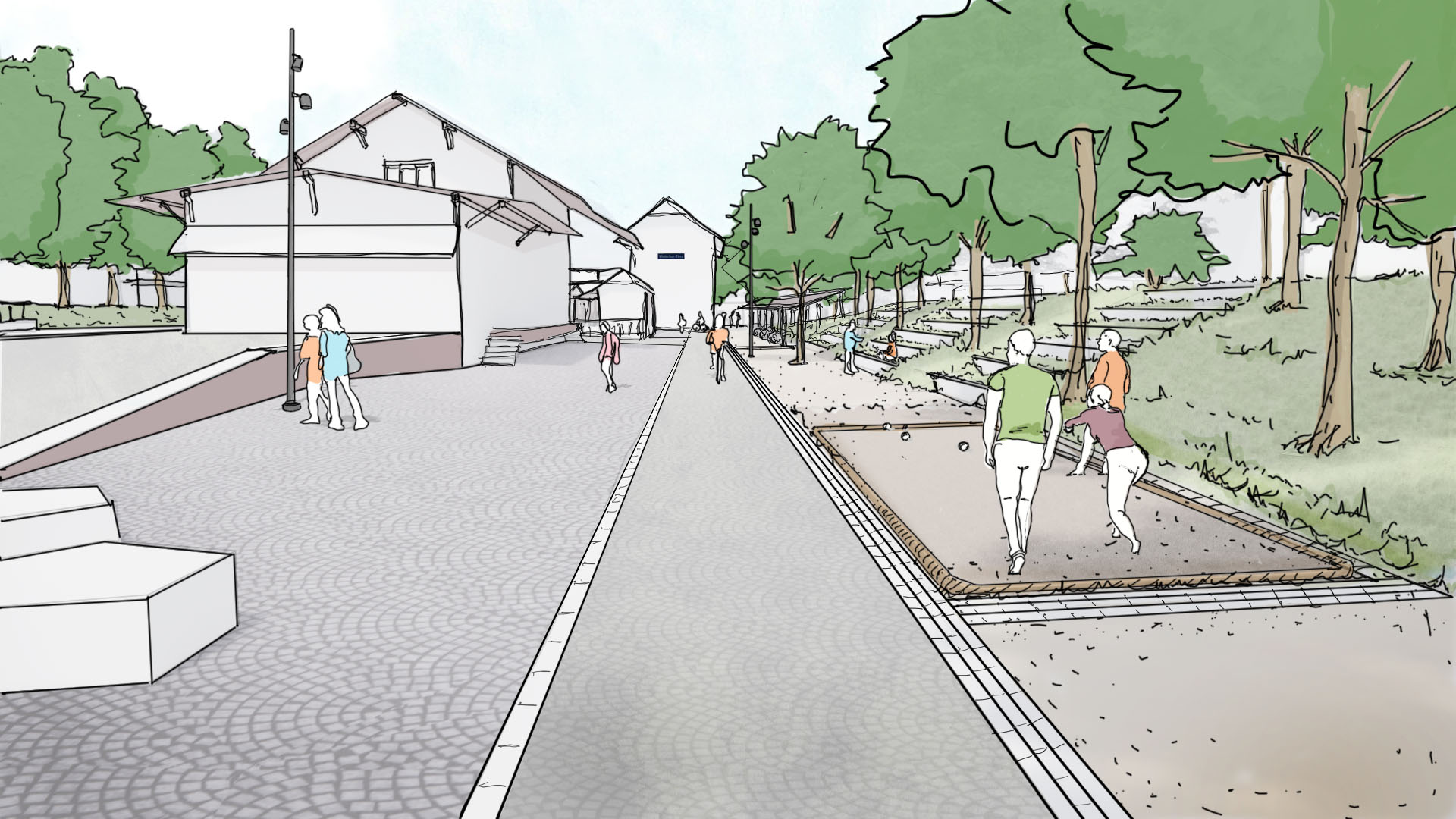 Der Dorfcharakter des Bahnhofplatzes soll mit der Aufwertung erhalten werden. Gleichzeitig soll der Platz als Treffpunkt und Begegnungsort gestärkt werden. Dazu wird die vor dem Güterschuppen bestehende Pflästerung für den gesamten Bahnhofplatz übernommen. Die bestehende Sitztreppe zwischen Bahnhofplatz und Güterstrasse wird erneuert und in drei Teile gruppiert, jeweils unterbrochen durch eine schattenspendende Baumgruppe aus bestehenden und neu zu pflanzenden Bäumen. Am Fuss der Böschung wird ein Kiesstreifen eingerichtet und ein Pétanque-Platz erstellt. Der Veloabstellplatz wird am alten Ort erneuert und erweitert auf sechzig überdachte Plätze. Die Autoparkierung wird vom Bahnhofplatz in die Stationsstrasse verschoben, wo sechs Parkfelder angeordnet werden.
