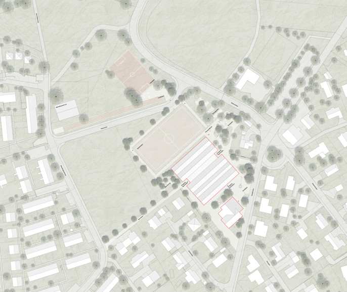 Das neue Schulgebäude selbst ist als kompakter, dreistöckiger Bau mit parallelen Satteldächern konzipiert, ergänzt durch eine Einfachturnhalle. Überzeugt hat die Jury die durchdachte Platzierung der Baukörper, aber auch deren Nachhaltigkeit. Schulhaus und Turnhalle sind in Holzbauweise konzipiert und folgen dem Gelände, so dass nur wenig Aushub nötig sein wird. Die einfach gehaltene Stützenkonstruktion ermöglicht es, das Raumkonzept in Zukunft flexibel anzupassen, sollten sich die Bedürfnisse dereinst ändern. Und im umgebauten Hofgebäude entsteht vielseitig nutzbarer Raum, welcher der ganzen Bevölkerung zugute kommen kann.