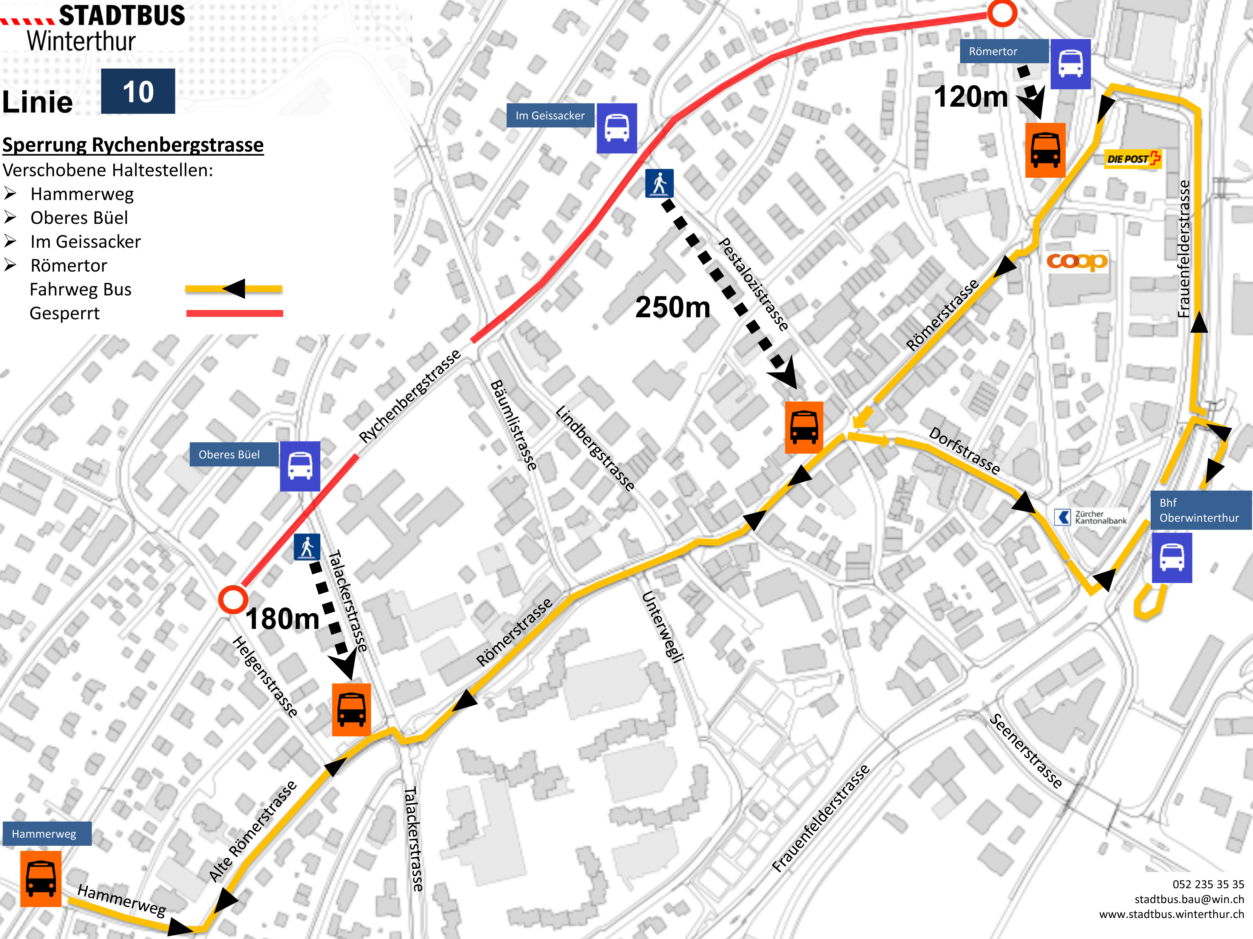 Während der Vollsperrung wird die Buslinie Nr. 10 im Abschnitt Hammerweg bis Stadlerstrasse über die Römerstrasse umgeleitet, während der übrige Verkehr über den Hammerweg, die Talacker- und die Frauenfelderstrasse geführt wird.
