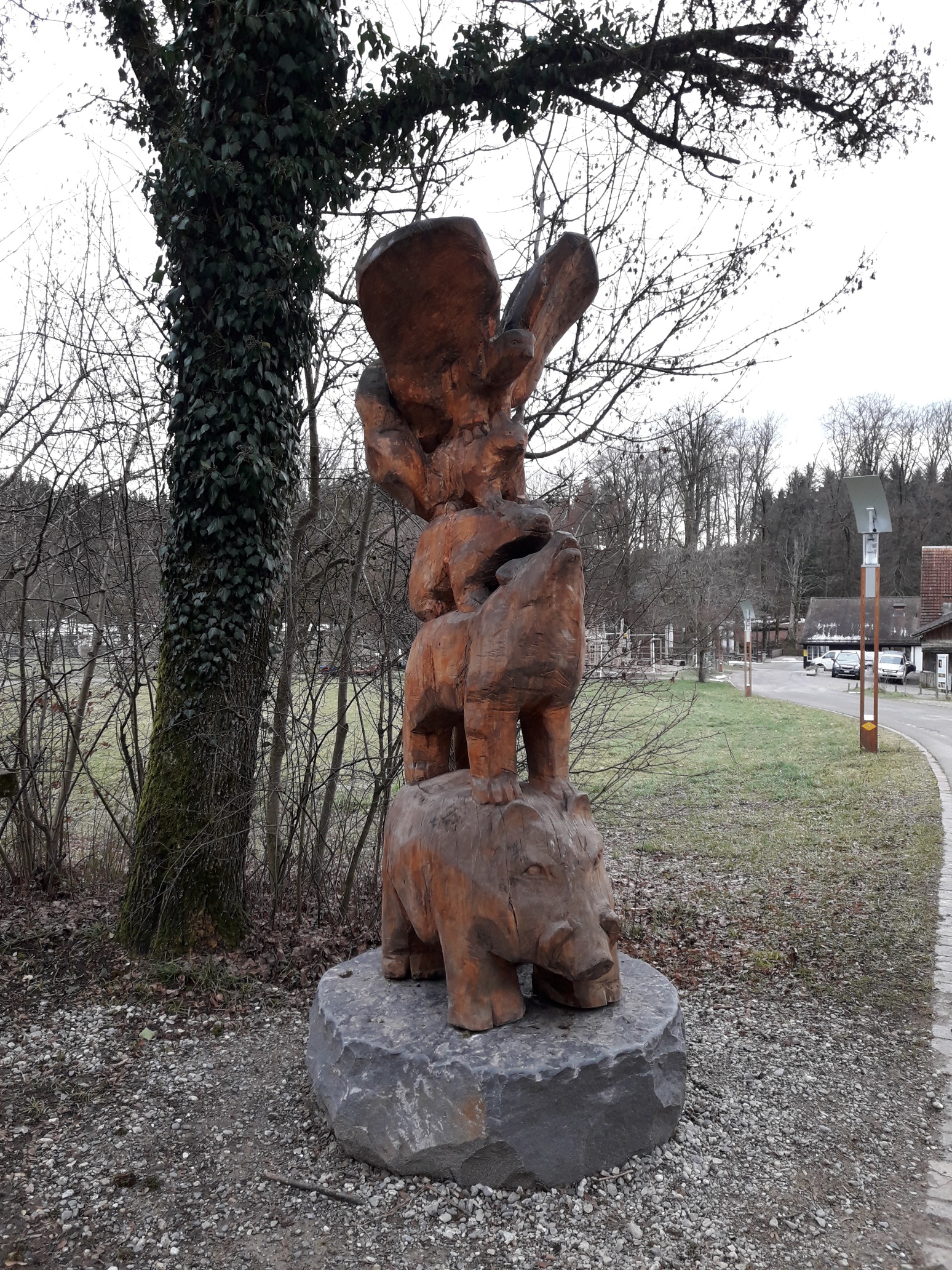 Die Skulptur ist aus Lindenholz gefertigt, drei Meter hoch und auf einem Sockel aus naturbelassenem Quarzsandstein montiert. Sie stellt die Tierwelt vom Eschenberg dar – Wildschwein, Wolf, Dachs, Eichhörnchen und Milan –, die sich, um gehört zu werden, zur «Wildschtägä» formiert.