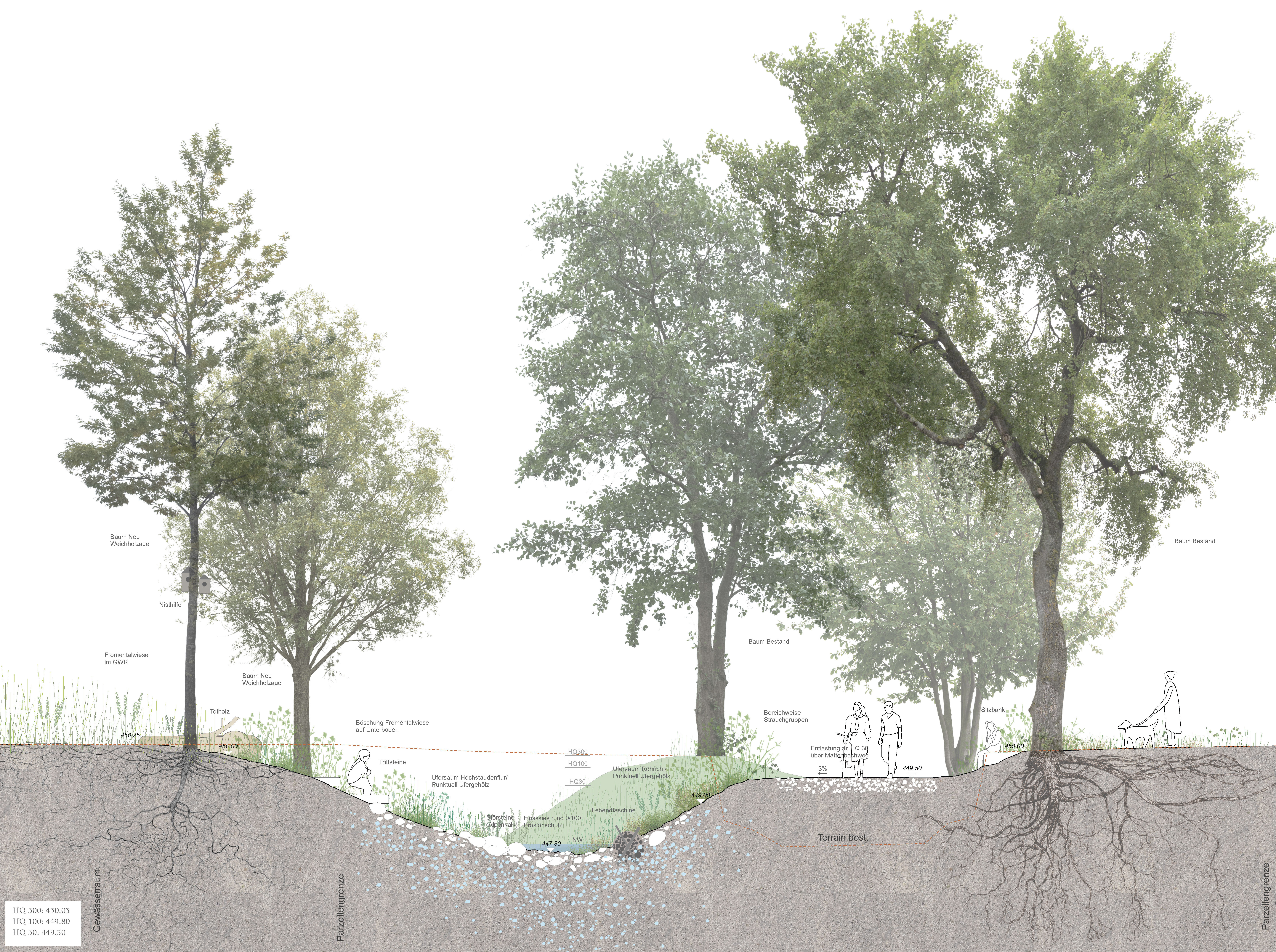 Um den Platzbedarf zulasten der Landwirtschaft und der Familiengärten (Pünten) gering zu halten, schlägt der Siegerentwurf vor, im Abschnitt zwischen Heinrich-Bosshard-Strasse und Schulhaus Mattenbach auf einen südlichen Uferweg ganz zu verzichten oder ihn nur als Trampelpfad auszugestalten. Die Pünten blieben dabei wie gewohnt erreichbar. Ob der südseitige Trampelpfad genügt, oder doch ein durchgehendes Angebot für Fussgänger:innen und Unterhaltsarbeiten zu schaffen ist, mit entsprechend grösserem Platzbedarf, ist in der weiteren Bearbeitung nochmals vertieft zu prüfen.