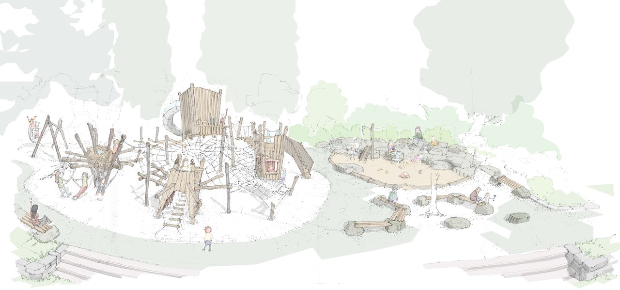 Konkret soll in der Mitte der neuen Spielplatzanlage ein begehbares, gross dimensioniertes und erhöht liegendes Kletternetz den Dorfplatz symbolisieren. Unterschiedliche Kletter-, Bewegungs- und Geschicklichkeitselemente sowie verschiedene Rutschtypen aus Röhren, Stangen und Schalen bilden die umliegenden «Häuser». Für Kleinkinder wird ein Angebot in Form eines Dorfladens integriert, welches Versteck- und Rollenspiele erlaubt. Daneben wird ein grosszügiger Sand-Matschbereich mit Schwenkkran und Wasserpumpe geschaffen. Eine mit mäandrierenden, verschlungenen Wegen begehbare Hügellandschaftsskulptur aus bestehenden Sandsteinelementen soll diesen Sand-Matschbereich einrahmen. Schaukeln werden auch nicht fehlen.