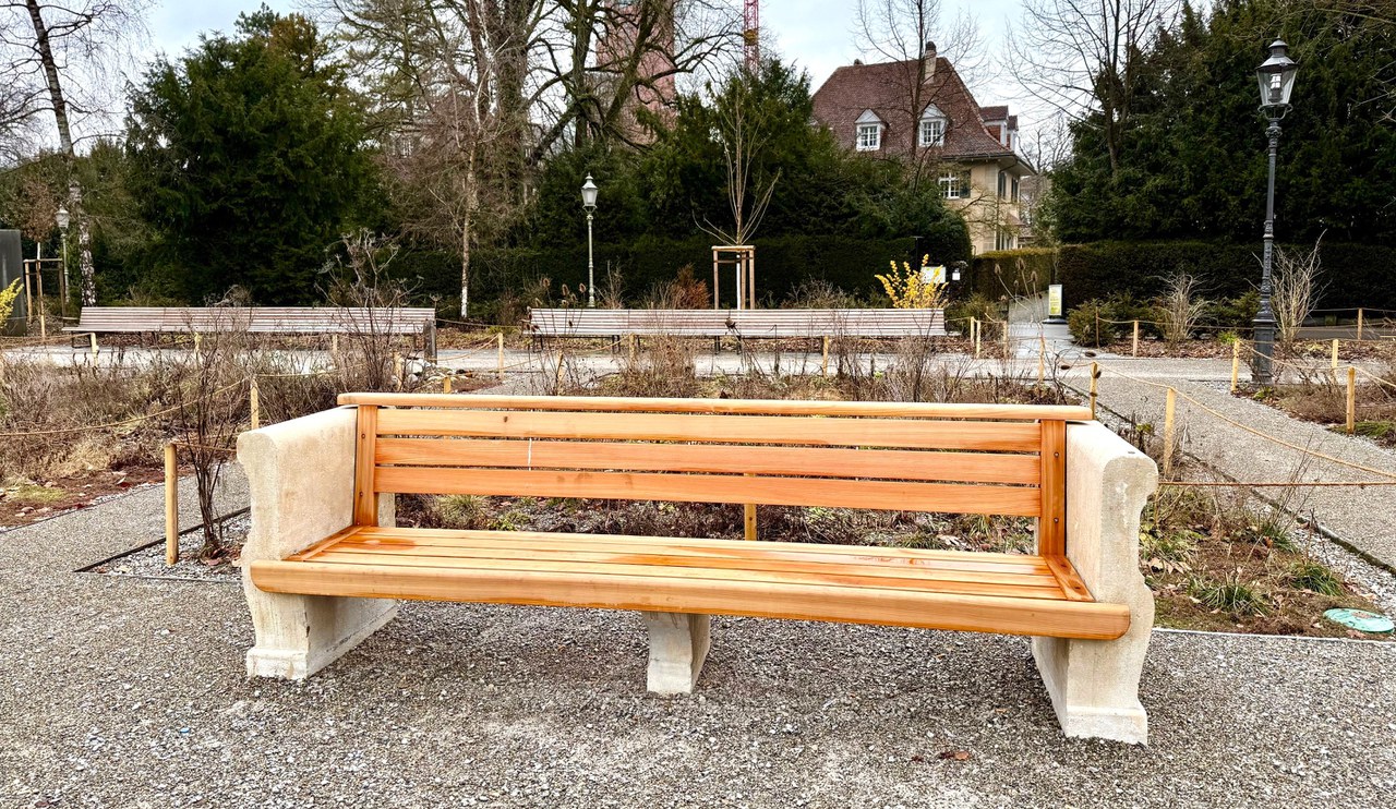 Neben den neuen Sitzbänken wurden auch die historischen Bänke als Zeitzeugen restauriert. Die Löcher und Bruchstücke in den Steinsockeln wurden aufgefüllt, alles vorsichtig gesandstrahlt, geputzt und auf eine neue Sitzhöhe gerichtet. Sitzfläche und Rückenlehne aus naturbelassenem Lärchenholz wurden durch eine weiterentwickelte und wartungsfreundlichere Konstruktion ersetzt. Die drei historischen Bänke, prominent platziert zwischen Blumengarten, Wasserbecken und Museum Oskar Reinhart ergänzen das Sitzplatzangebot.