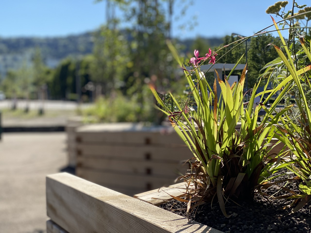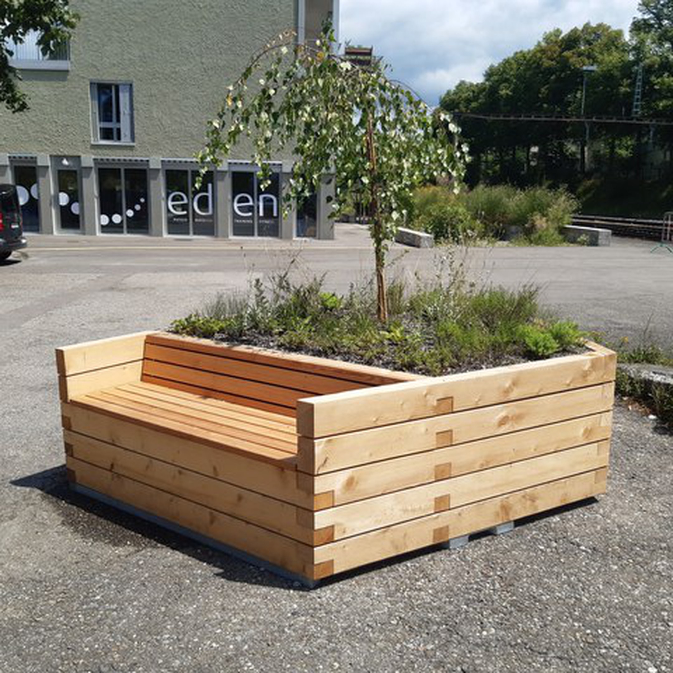 Hier können die von Produktdesigner Winfried Schneider entwickelten fünfeckigen Behälter von rund zweieinhalb Metern Durchmesser zu Einsatz kommen. Die riesigen Tröge beherbergen nicht nur Bäume, Sträucher und Stauden, sondern sind gleichzeitig auch Sitzgelegenheiten. Modular können die Pflanztröge mit vertikalen Stangen erweitert und, bepflanzt mit Kletterpflanzen, zu kühlenden Schattenspendern werden. Gefertigt haben die Tröge eine lokale Zimmerei und Schlosserei. Verwendet wurde dazu ausschliesslich Winterthurer Holz. Die mobilen Tröge sind so konzipiert, dass sie einzeln oder in Gruppen aufgestellt werden können.
