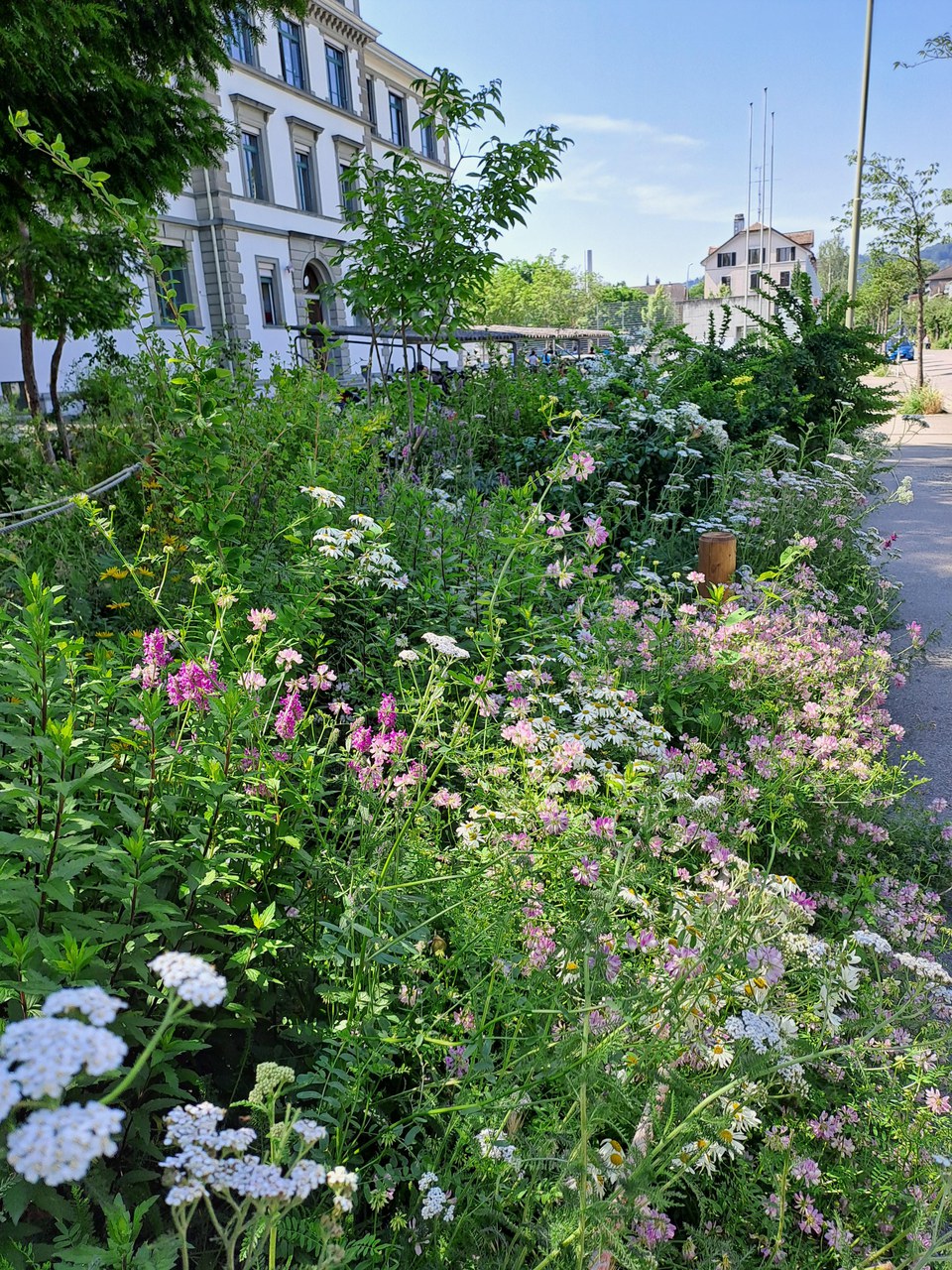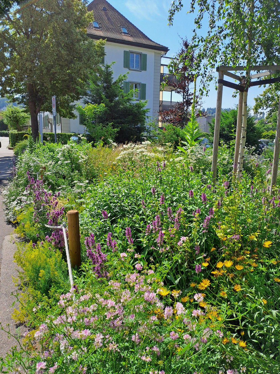 Über drei Jahre hinweg wurde der grüne Gürtel rund um die Tössfeldanlage erneuert. Dunkle Eibendickichte und kahle Böden durften für eine vielfältige Blütenhecke mit Staudenunterpflanzung weichen. Die Stauden übernehmen die ersten Jahre prominent die Zierwirkung. Mit dem Wachstum der Sträucher werden sie in den kommenden Jahren etwas zurückgedrängt – so wird die Bepflanzung dem Zielbild der historischen Anlage entsprechen.