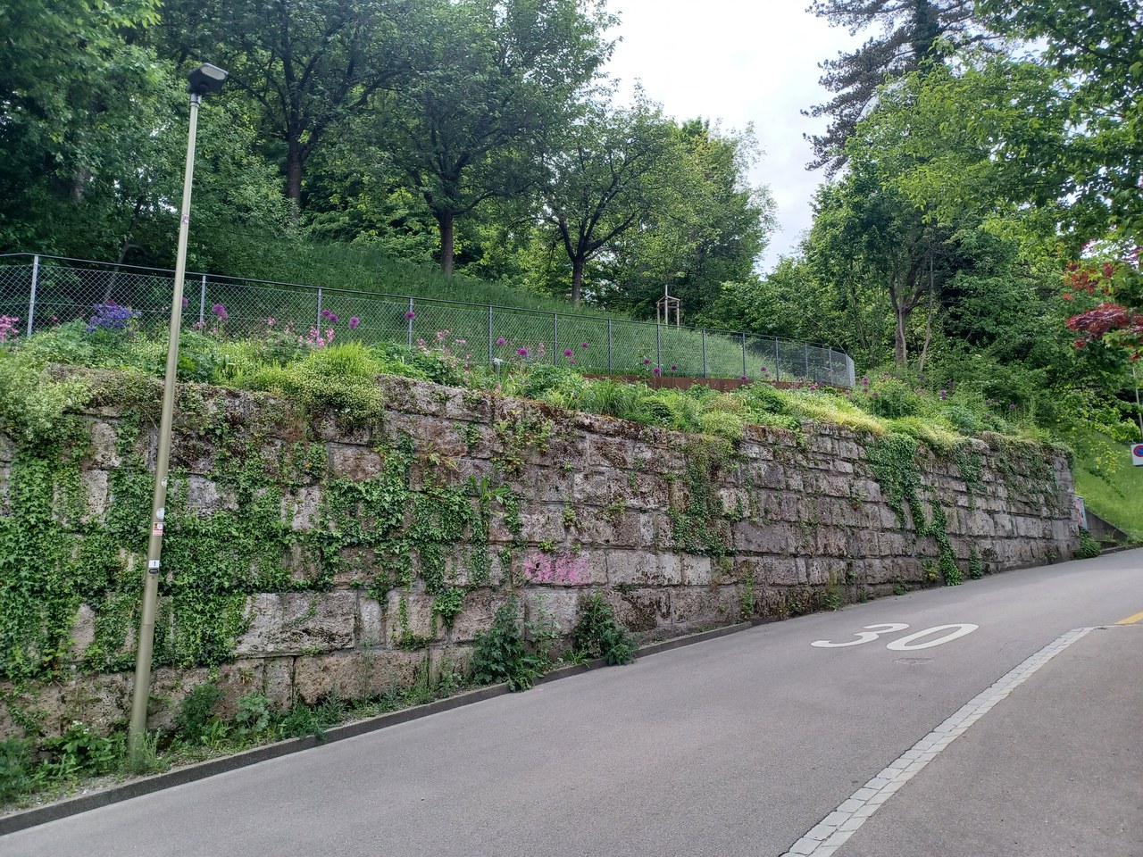 Mauersanierung Heiligbergpark Bild Legende: Blühende Mauerkrone Bild Legende: Nach einer umfassenden Sanierung der historischen Stützmauer wurde die Mauerkrone neu mit einer Staudenmischpflanzung begrünt. Aufgrund der Absturzgefahr wird die Pflege mit Hilfe eines Sicherheitsseils durchgeführt.