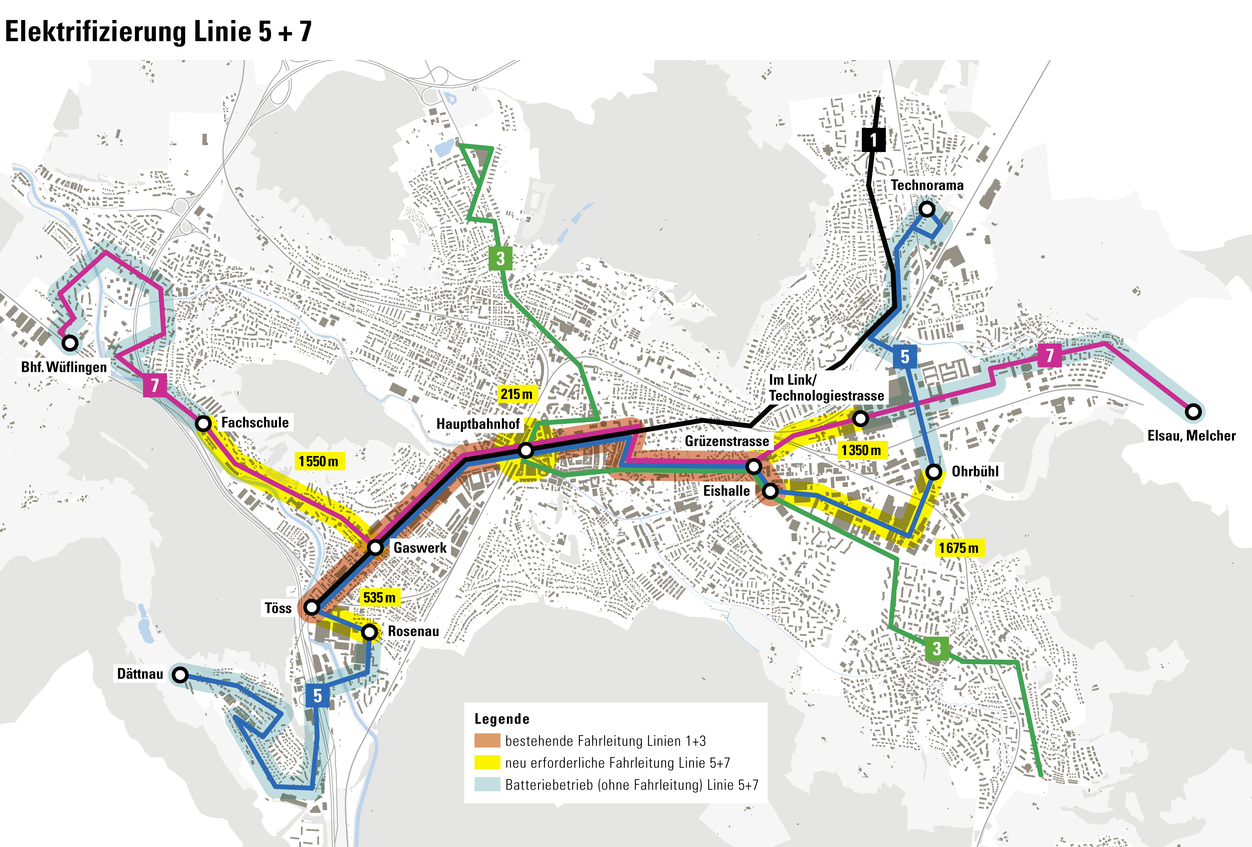 Die ersten grossen Schritte hin zur weiteren Elektrifizierung der Stadtbusflotte stehen bevor. Mit der Elektrifizierung der Linien 5 und 7 sollen künftig 90 Prozent der Busfahrgäste der Stadt Winterthur elektrisch, CO2-neutral und möglichst leise befördert werden. Die Kernelemente sind: