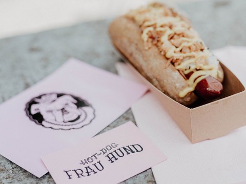 Knuspriges Mehrkornbrötli, hausgemachte Toppings und ein würziges, veganes Merguez-Würstchen – das sind Frau Hunds Hot-Dogs. Mit dem Klassiker «Deutsche Dogge» mit feinem Sauerkraut, Honig-Senf und Röstzwiebeln, dem süss-salzigen «Bastardo» oder der frischen «Römer Schnauze» mit Rucola und Peperoni-Salsa und Trüffel-Sticks, ist bei Frau Hund für jeden Geschmack etwas dabei.
