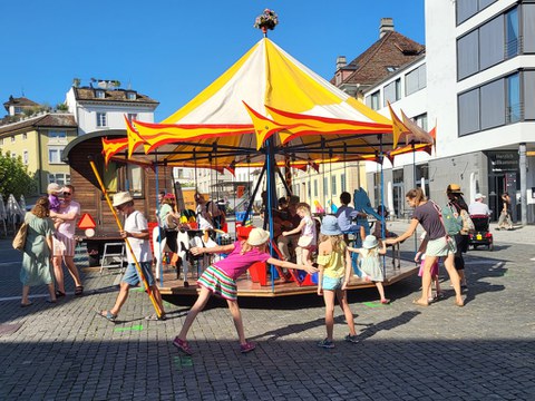 Das einzigartige, mit Muskelkraft betriebene Familienkarussell mit Live-Musik.