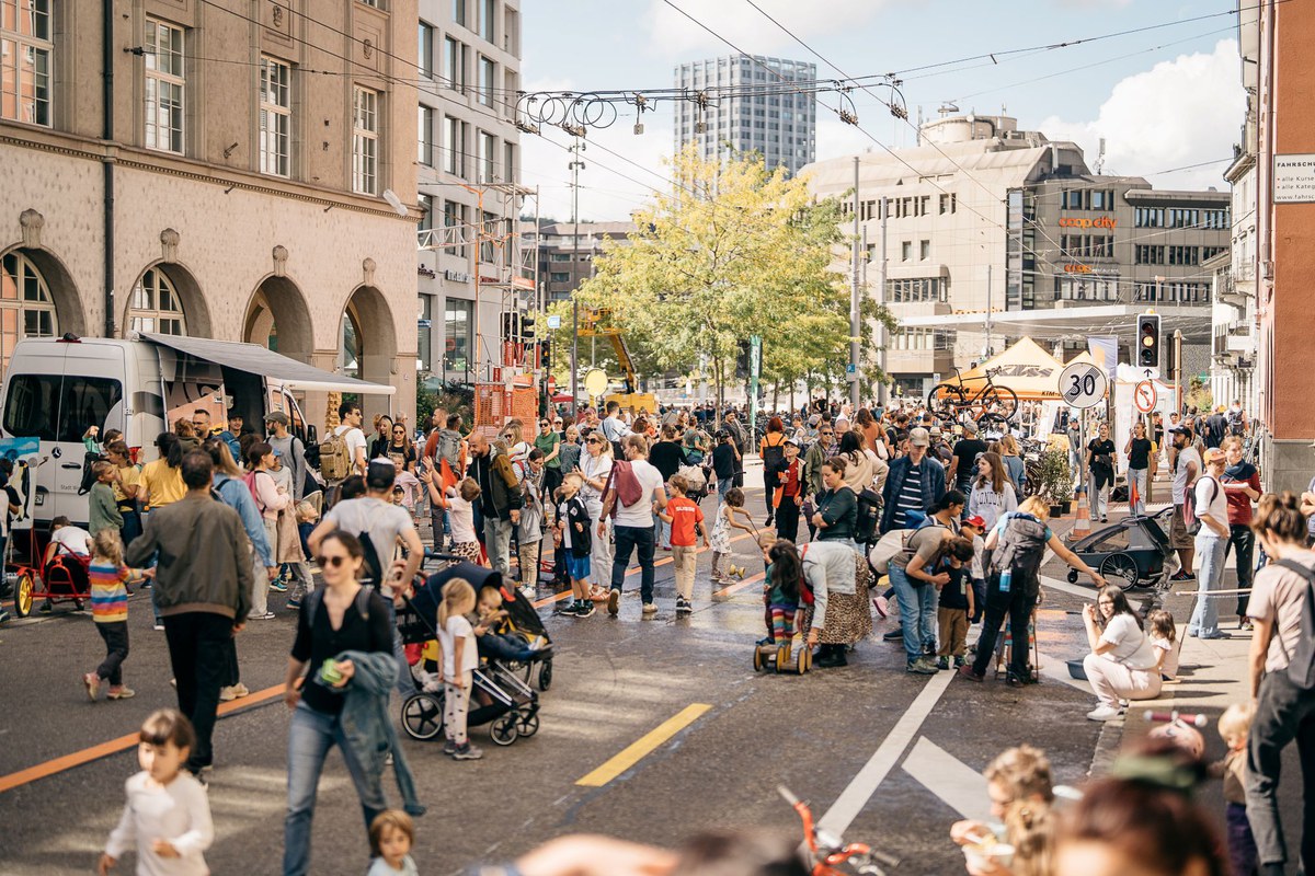 Wo sonst Autos fahren, wird gespielt und flaniert, werden neue Fortbewegungsmittel ausprobiert und Klimafragen diskutiert. Auch ein selbst gemachtes Picknick, eigene Spiele, Rollschuhe und Velos sind willkommen.