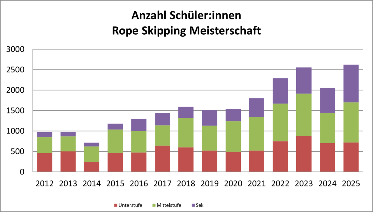 Über 2500 Schülerinnen und Schüler aus 148 Klassen haben an der diesjährigen Rope Skipping Meisterschaft teilgenommen. Es hat mehrere Einträge in die ewige Bestenliste gegeben und für die Aktion "Hüpfend Gutes tun" zugunsten der Kinderkrebsforschung konnten knapp 4000.- ersprungen werden!