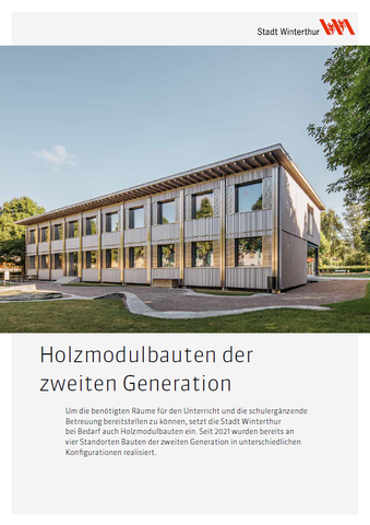 Um die benötigten Räume für den Unterricht und die schulergänzende Betreuung bereitstellen zu können, setzt die Stadt Winterthur bei Bedarf auch Holzmodulbauten ein. Seit 2021 wurden bereits an vier Standorten Bauten der zweiten Generation in unterschiedlichen Konfigurationen realisiert.
