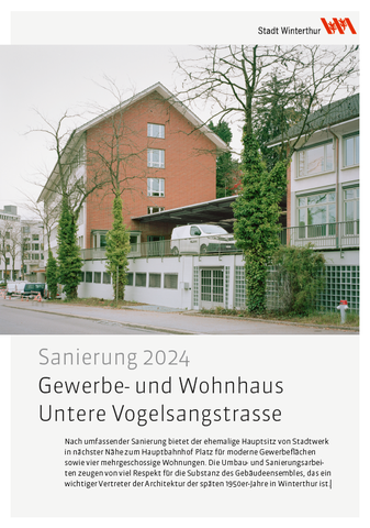 Nach umfassender Sanierung bietet der ehemalige Hauptsitz von Stadtwerk in nächster Nähe zum Hauptbahnhof Platz für moderne Gewerbeflächen sowie vier mehrgeschossige Wohnungen. Die Umbau- und Sanierungsarbeiten zeugen von viel Respekt für die Substanz des Gebäudeensembles, das ein wichtiger Vertreter der Architektur der späten 1950er-Jahre in Winterthur ist.