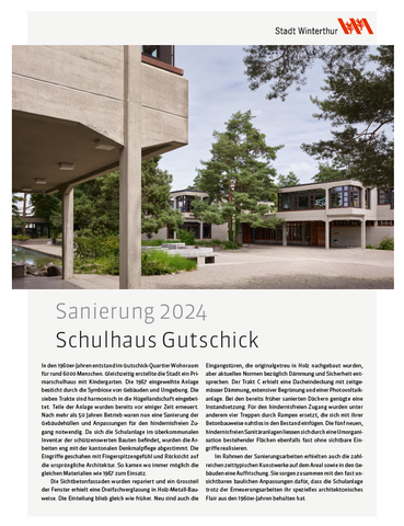 In den 1960er-Jahren entstand im Gutschick-Quartier Wohnraum für rund 6000 Menschen. Gleichzeitig erstellte die Stadt ein Primarschulhaus mit Kindergarten. Die 1967 eingeweihte Anlage besticht durch die Symbiose von Gebäuden und Umgebung. Die sieben Trakte sind harmonisch in die Hügellandschaft eingebettet. Teile der Anlage wurden bereits vor einiger Zeit erneuert. Nach mehr als 50 Jahren Betrieb waren nun eine Sanierung der Gebäudehüllen und Anpassungen für den hindernisfreien Zugang notwendig. Da sich die Schulanlage im überkommunalen Inventar der schützenswerten Bauten befindet, wurden die Arbeiten eng mit der kantonalen Denkmalpflege abgestimmt. Die Eingriffe geschahen mit Fingerspitzengefühl und Rücksicht auf die ursprüngliche Architektur.