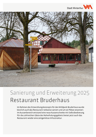 Im Rahmen des Entwicklungskonzepts für den Wildpark Bruderhaus wurde kürzlich auch das Restaurant teilweise saniert und um 30 Plätze erweitert. Im Aussenbereich entstand eine neue Aussenschenke mit Selbstbedienung. Für die zahlreichen Gäste des Naherholungsgebiets bietet jetzt auch das Restaurant wieder eine zeitgemässe Infrastruktur.