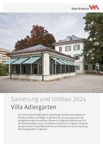 Die historische Villa Adlergarten beherbergt neu Büroarbeitsplätze für den Bereich Alter und Pflege. Im Rahmen der Umnutzung wurden die weitgehend original erhaltenen Räume im Erdgeschoss gemeinsam mit der Denkmalpflege saniert, die Elektroinstallationen im ganzen Gebäude wurden erneuert sowie Massnahmen zum Brandschutz und zur Senkung des Energiebedarfs umgesetzt.
