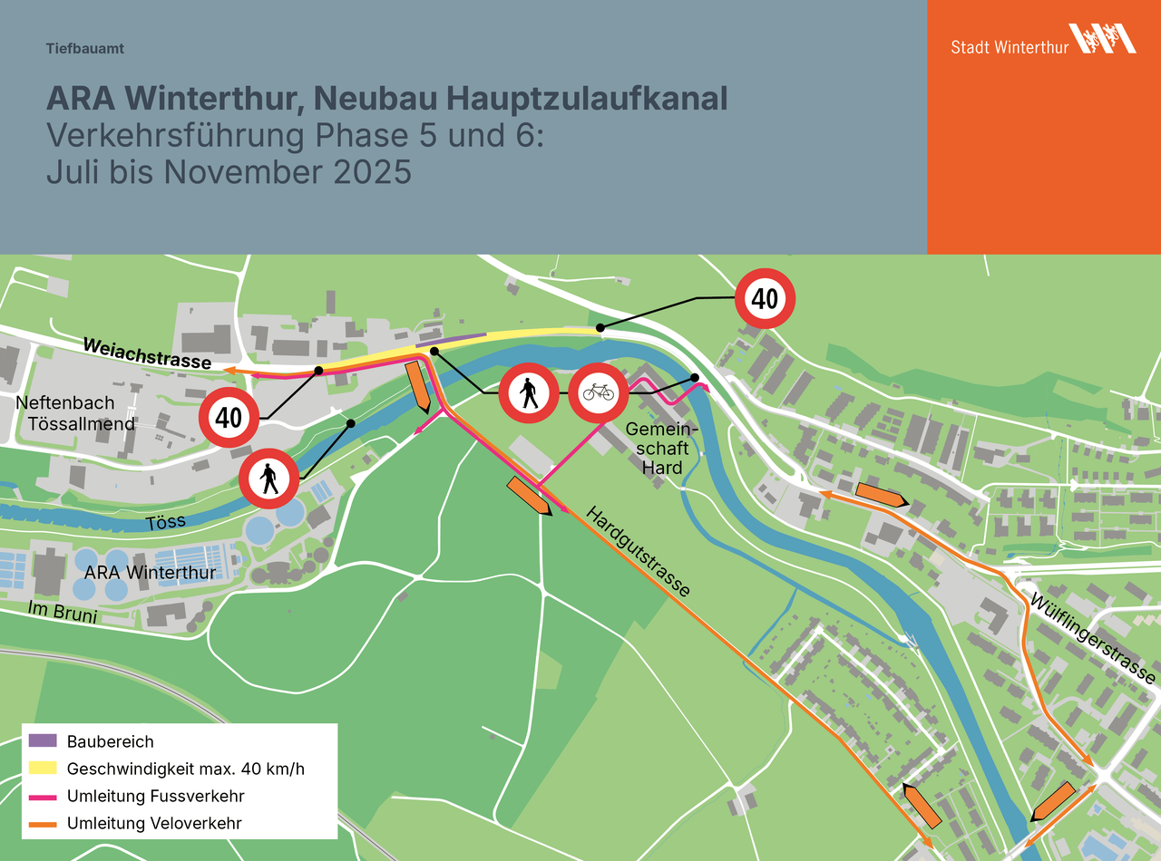 | Motorisierter Individualverkehr Die Geschwindigkeit ist im Baubereich auf 40 km/h beschränkt. Fuss- und Veloverkehr Ab der Brücke weicht der Veloverkehr auf die Hardgutstrasse aus, der Fussverkehr nutzt die Strasse durch die Gemeinschaft Hard. Der Wanderweg am Nordufer der Töss bleibt weiterhin gesperrt. |