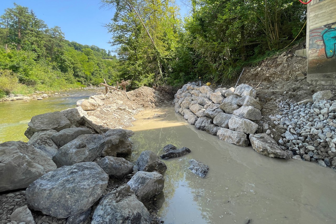 Der neue Hauptzulaufkanal in der Weiachstrasse ist planmässig bis Ende September erstellt. Ab Anfang Oktober folgen die Arbeiten für den Anschluss des neuen Kanals, gleichzeitig beginnen die Abbrucharbeiten des alten Kanals. Anschliessend wird die Strassenoberfläche provisorisch wiederhergestellt. Parallel dazu laufen die Wasserbauarbeiten im Bereich der Brückenpfeiler weiter – sowohl bei der bestehenden als auch bei der neuen Brücke.