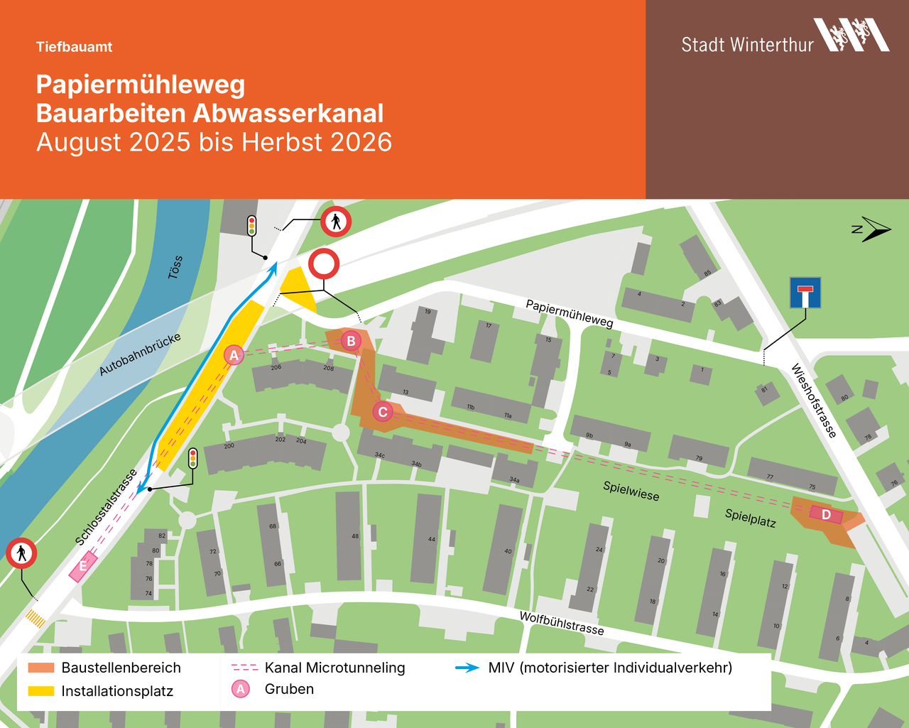 Die Einmündung des Papiermühlewegs in die Schlosstalstrasse wird für die Dauer der Bauarbeiten gesperrt. Der Papiermühleweg wird zur Sackgasse und ist während dieser Zeit nur von der Wieshofstrasse her befahrbar.