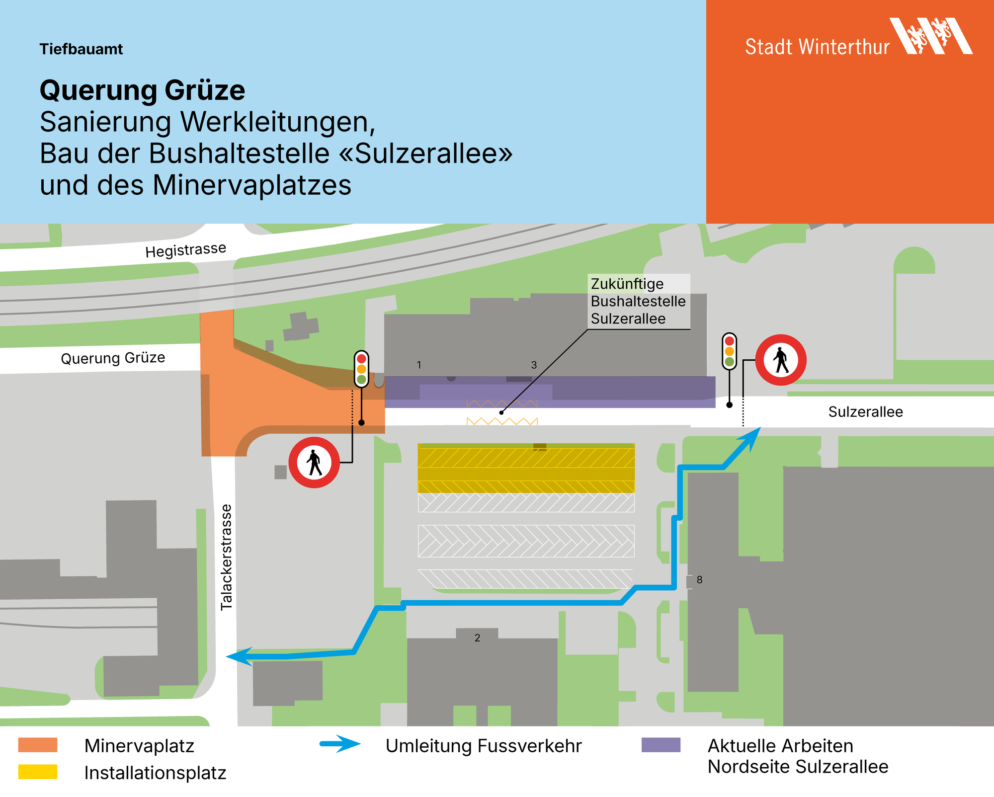 Für Fussgängerinnen und Fussgänger von der und zur Sulzerallee ist eine Umleitung über den Parkplatz signalisiert.