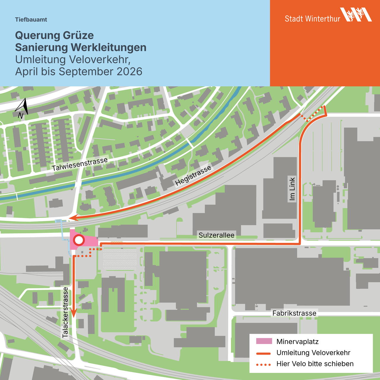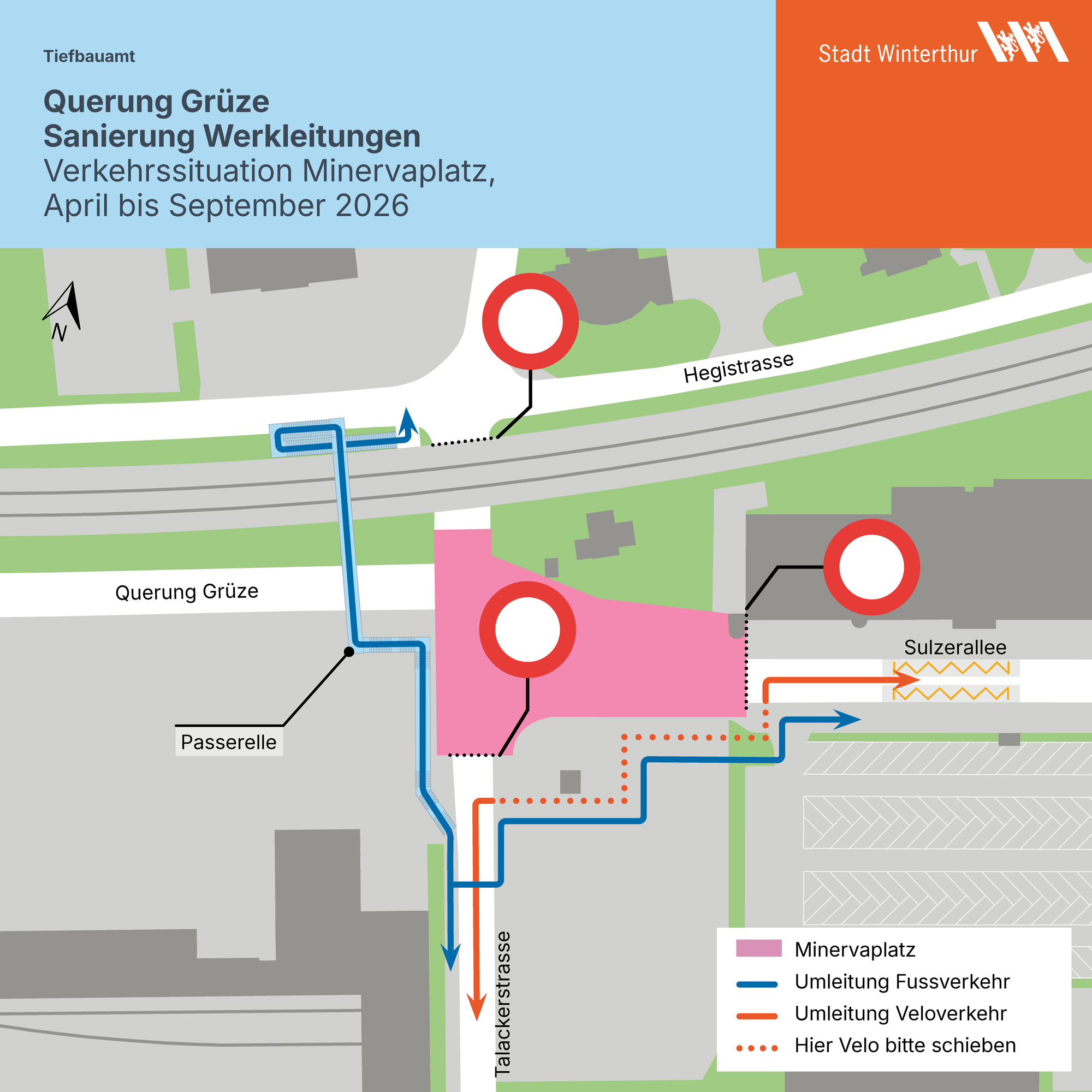 Der Veloverkehr wird über die Hegistrasse und die Unterführung zur Strasse Im Link geführt. Der Minervaplatz kann über einen signalisierten Fussweg umgangen werden.