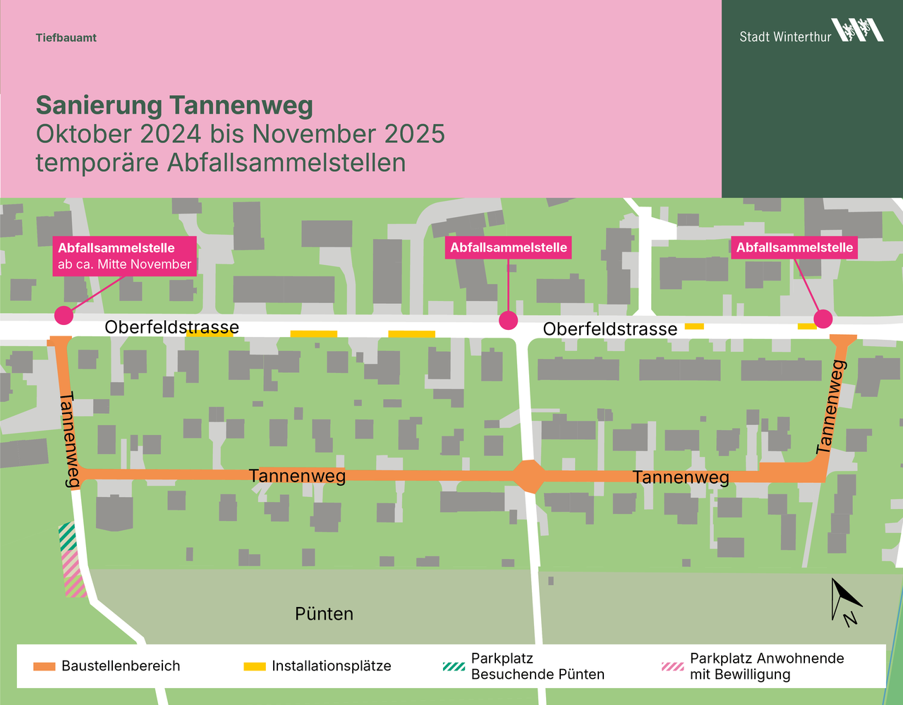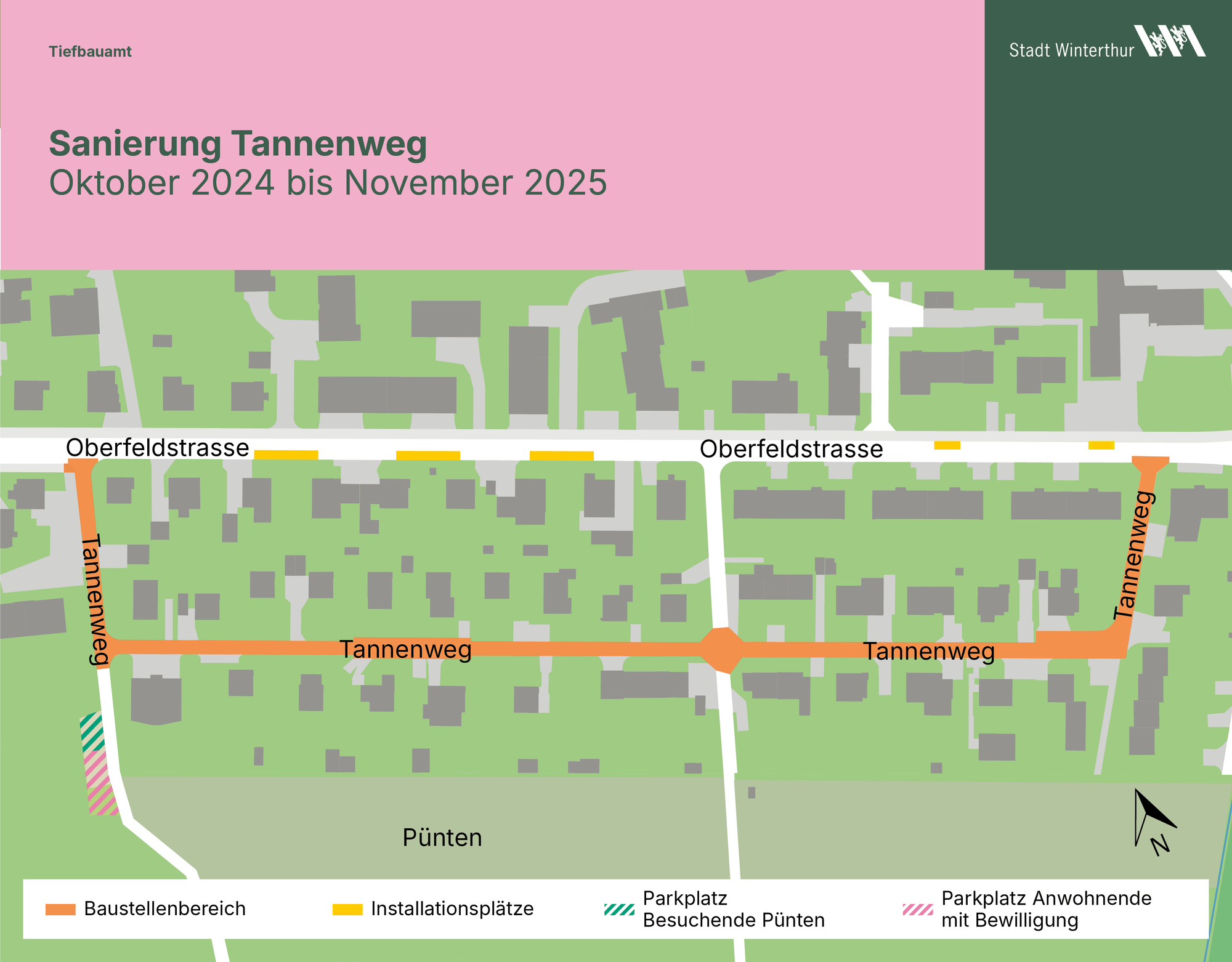 Die Verkehrseinschränkung wird in der Oberfeldstrasse signalisiert. Anwohnende und Püntikerinnen und Püntiker richten sich nach der aktuellen Bausituation und nutzen entweder die westliche oder die östliche Zufahrt in den Tannenweg.