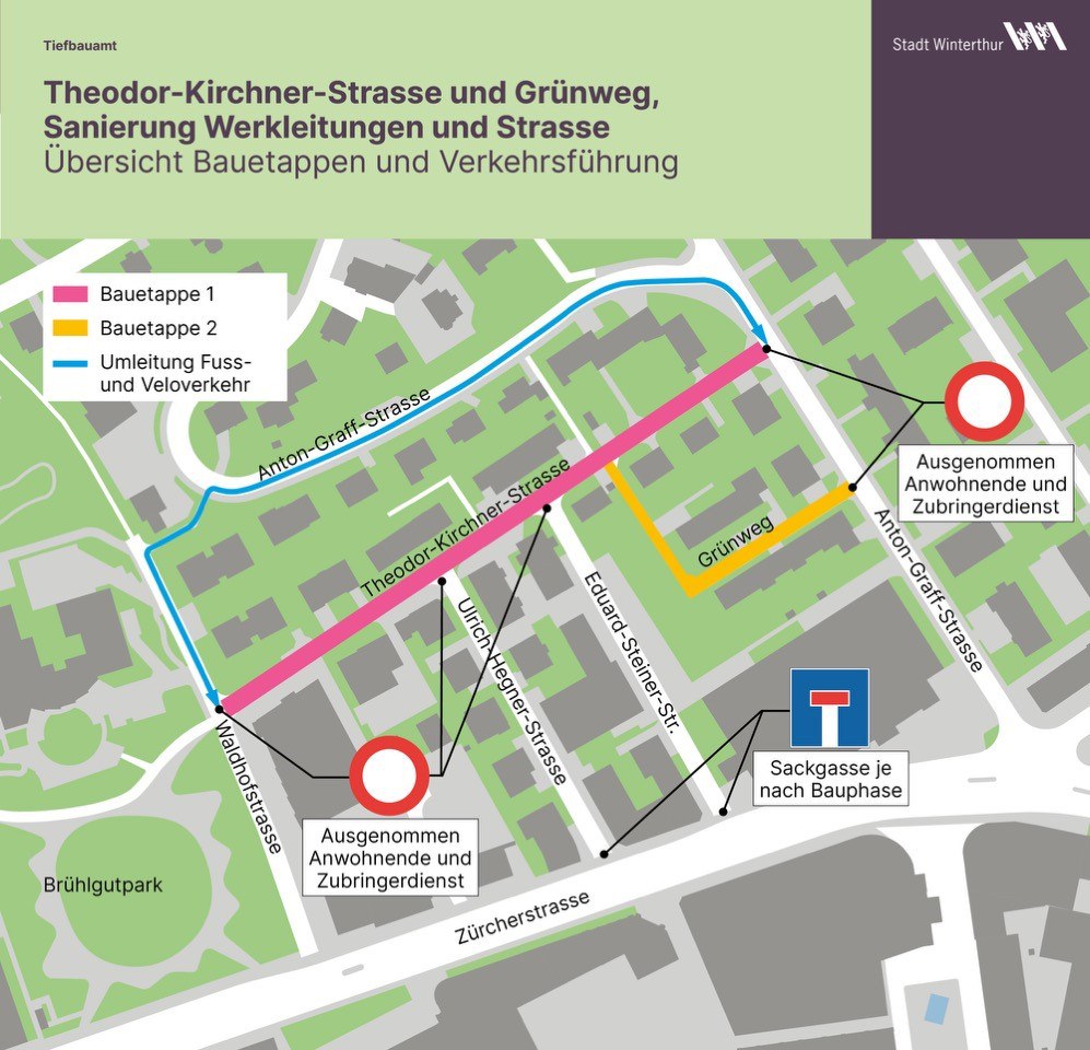Ab. 8. Januar 2024 und bis zum Abschluss der Arbeiten Mitte 2025 bleiben die Theodor-Kirchner-Strasse und der Grünweg für den gesamten Durchgangsverkehr komplett gesperrt. Das gilt sowohl für den motorisierten Individualverkehr wie auch für den Velo- und den Fussverkehr.