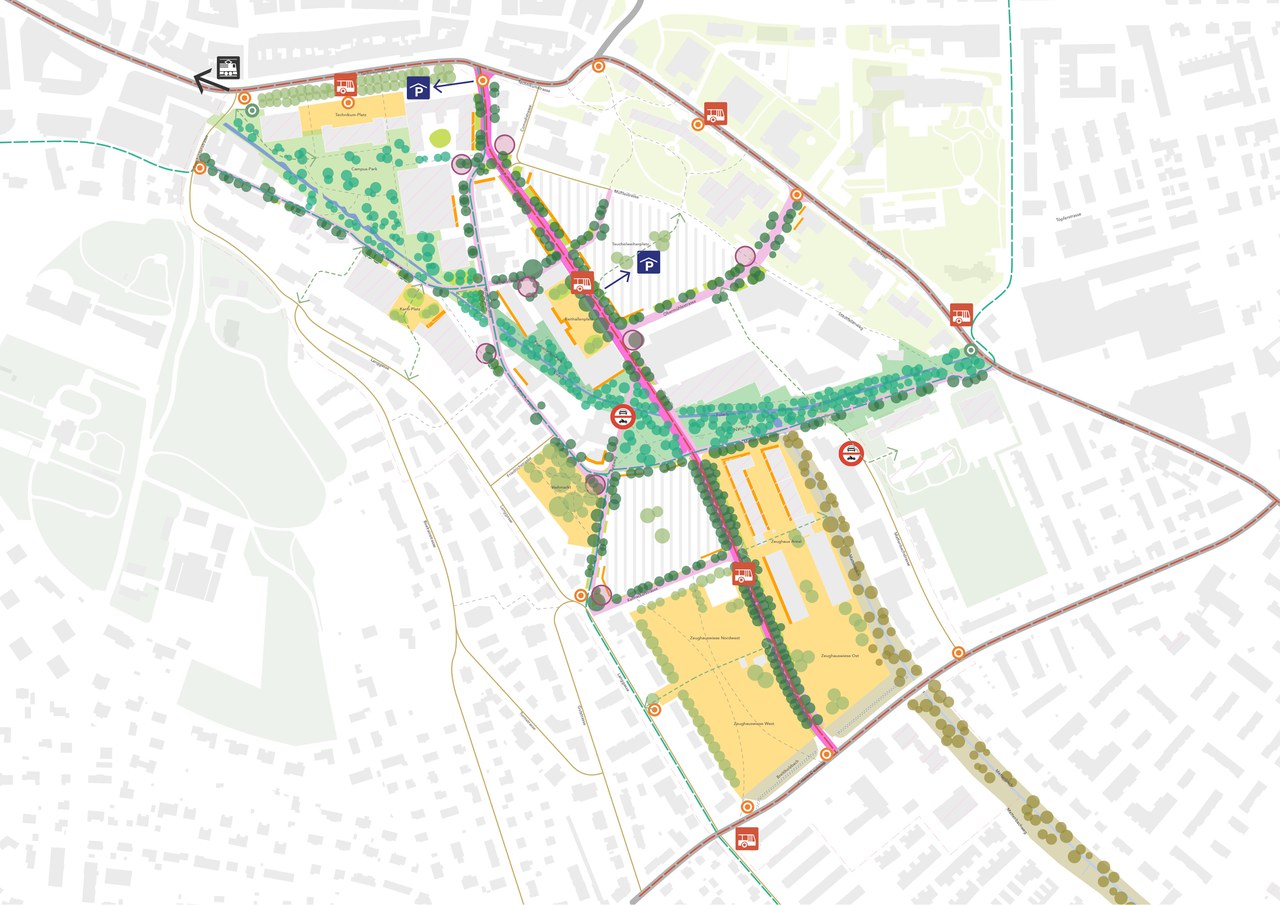 Untersucht wurde im Masterplan auch die Verkehrserschliessung sowie die Vernetzung durch Fusswege. Der Masterplan widmet sich zudem sechs spezifischen Orten und lotet ihr Potenzial aus. Dies sind der Technikum-Platz, der Kanti-Platz, der Reithallenplatz, der Viehmarkt, das Zeughausareal und die zwei Zeughauswiesen. Letztere stehen im Fokus als Ersatzstandort für Veranstaltungen, wenn der Teuchelweiherplatz dereinst umgenutzt wird.