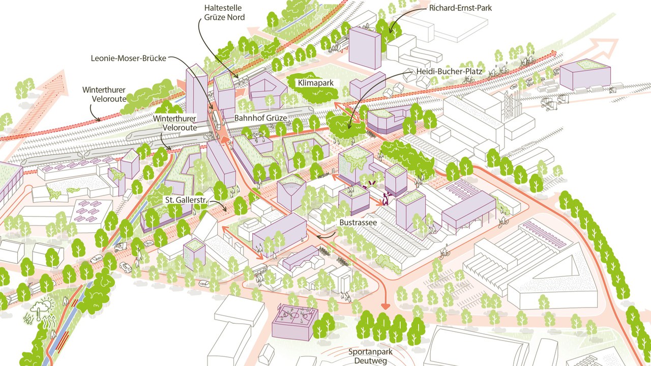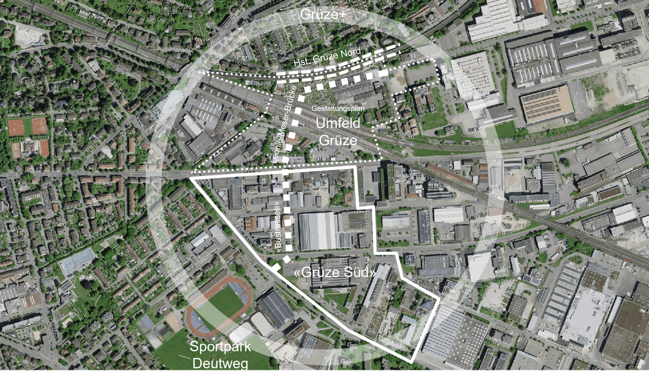 Der kantonale Richtplan zeichnet das Gebiet um den Bahnhof Grüze als Zentrumsgebiet aus. In den nächsten 15 Jahren soll es zu einem neuen Stadtteil heranwachsen – erschlossen durch den zweitgrössten Winterthurer Stadtbahnhof.