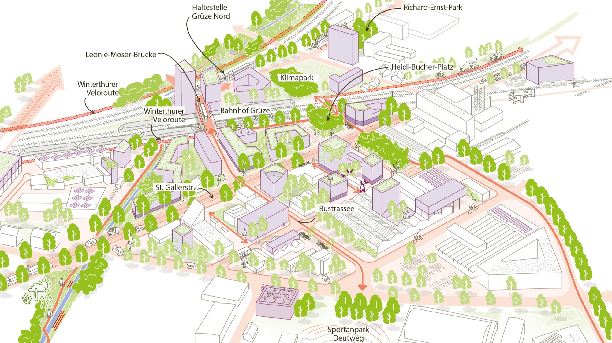 Mit der neuen Leonie-Moser-Brücke (Umstieg auf den Bus) und dem Ausbau des Bahnhofs Grüze (Haltestelle Grüze Nord) entsteht eine erstklassige Anbindung an den öffentlichen Verkehr. Der Bahnhof Grüze erhält bis 2050 ein S-Bahn-Angebot, das mit dem heutigen am Hauptbahnhof vergleichbar ist.