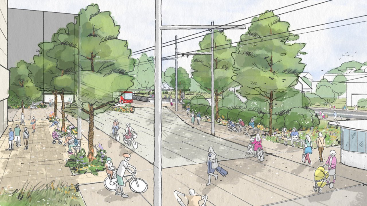 Visualisierung Minervaplatz (Ecke Sulzerallee/Talackerstrasse) mit Blick auf Haltestelle Nord (Studio Vulkan)