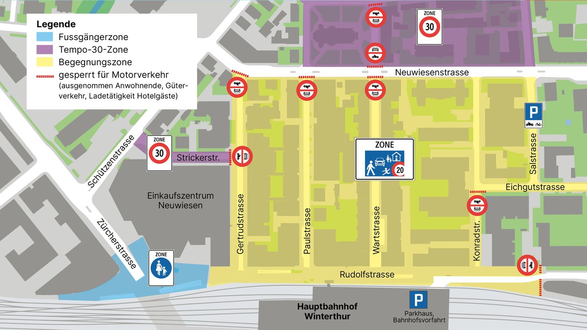Seit April 2024 gilt zwischen der Neuwiesenstrasse und dem Hauptbahnhof Tempo 20 und Vortritt für Fussgänger. Der Stadtraum wurde dank der Verkehrsberuhigung, der Umgestaltung und den neuen Zugängen zur Bahnhofsunterführung deutlich aufgewertet.