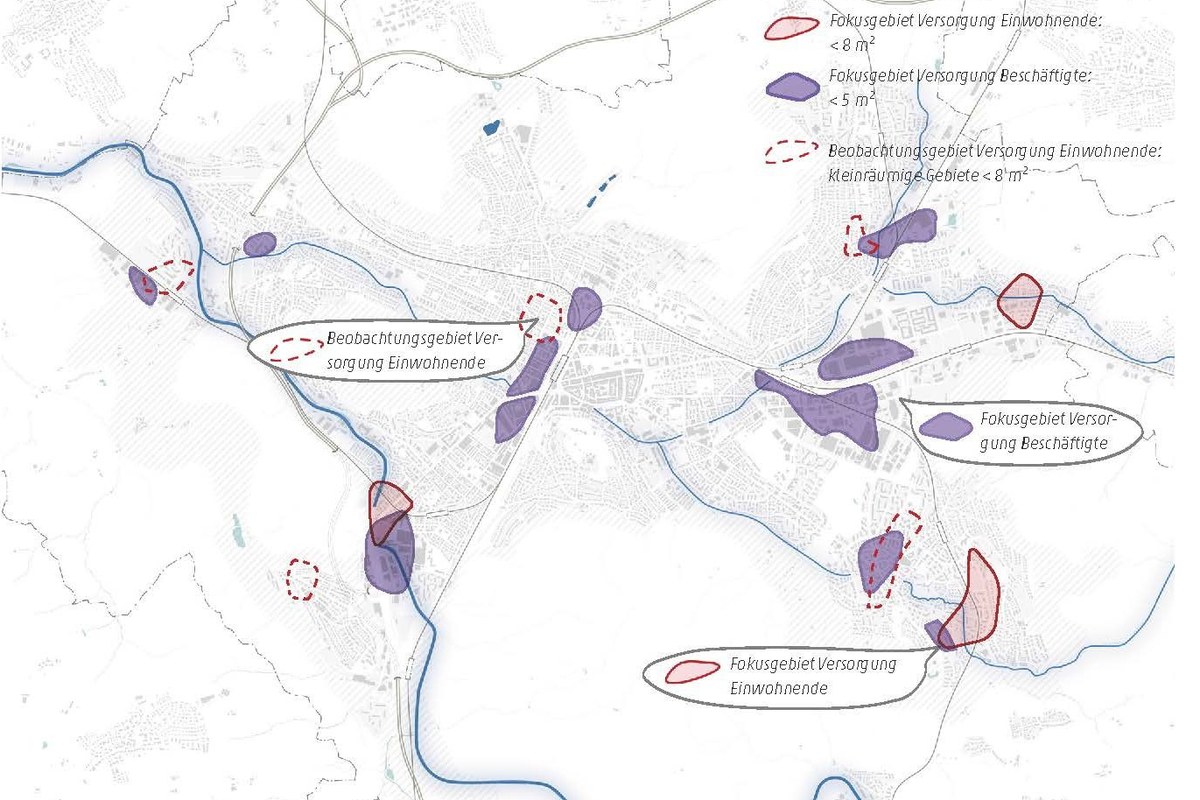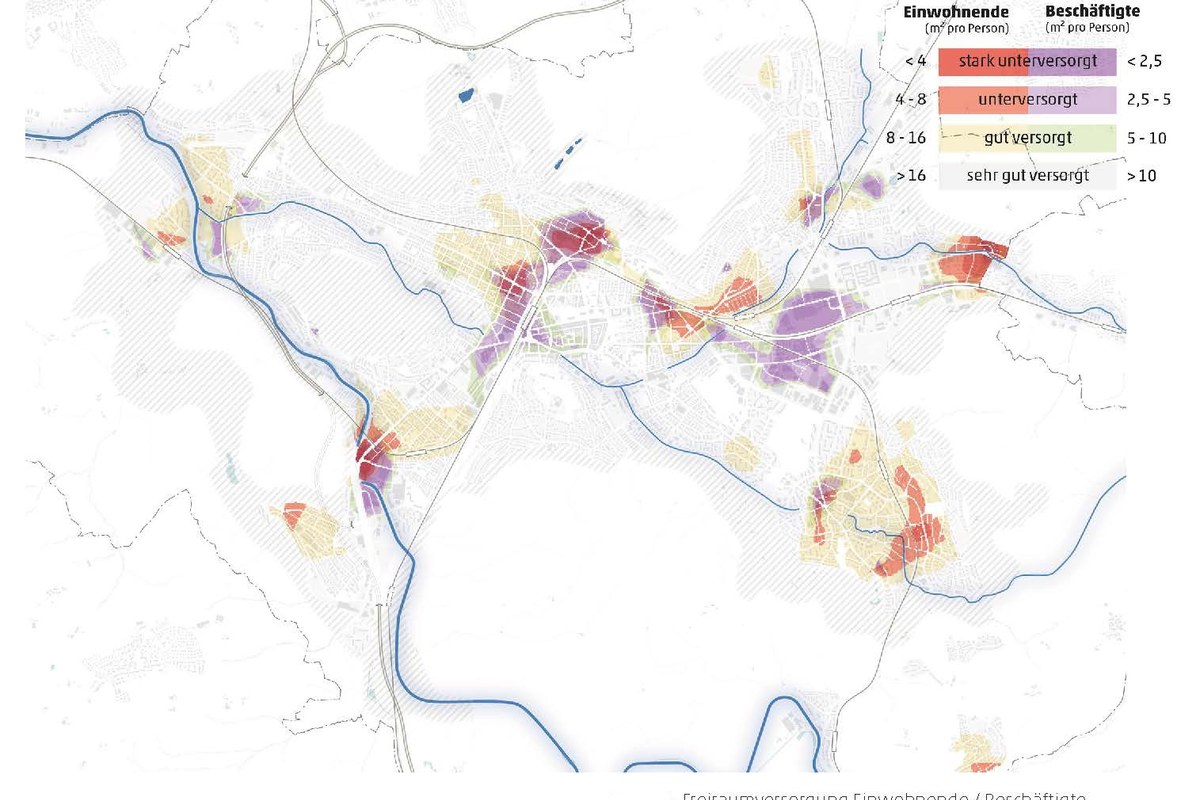 - Quantitativ wurden Mindestfreiraumflächen definiert und das heutige Angebot hinsichtlich Fläche, Leistungsfähigkeit und Erreichbarkeit für die Bevölkerung wie auch Arbeitnehmende analysiert.