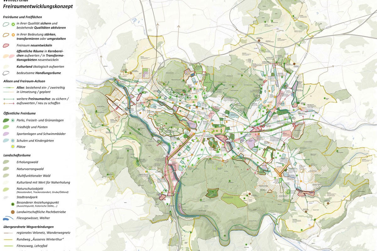 Die Freiraumstrategie Winterthur baut auf der im Jahr 2021 verabschiedeten Räumlichen Entwicklungsperspektive Winterthur 2040 auf und ersetzt den Leitfaden zur Weiterentwicklung und Positionierung der Gartenstadt Winterthur von 2013. Die Entwicklungsperspektive hat dabei unter anderem das freiräumliche Leitbild der drei Landschaften geprägt. Die Freiraumstrategie vertieft nun diese räumlichen Entwicklungsabsichten.
